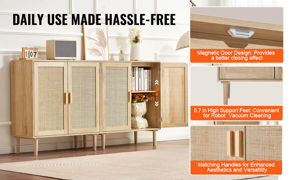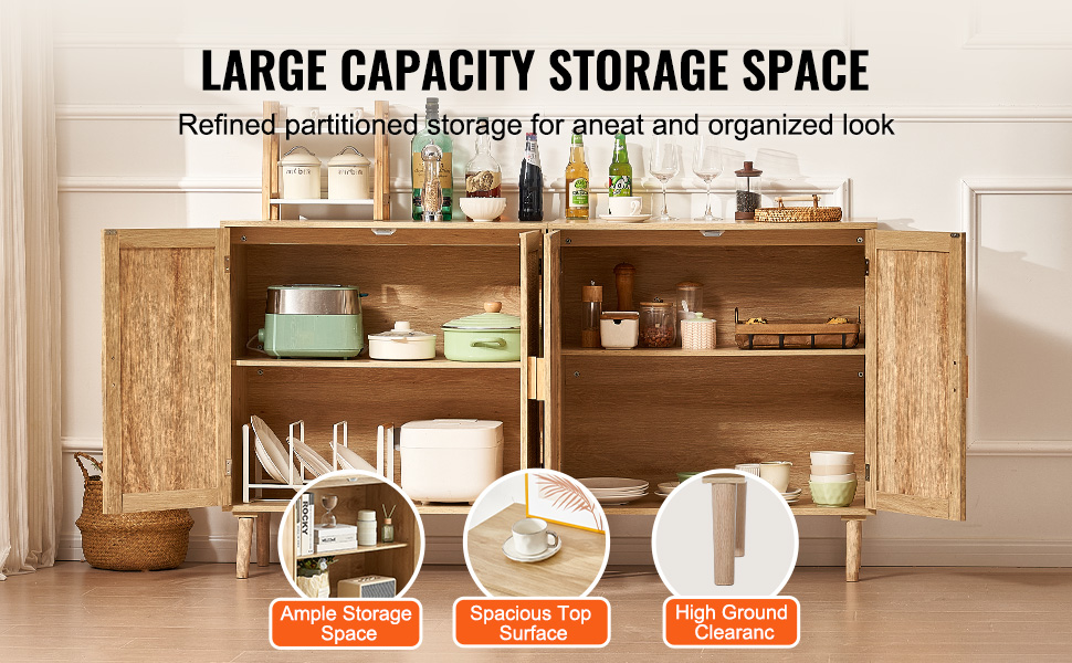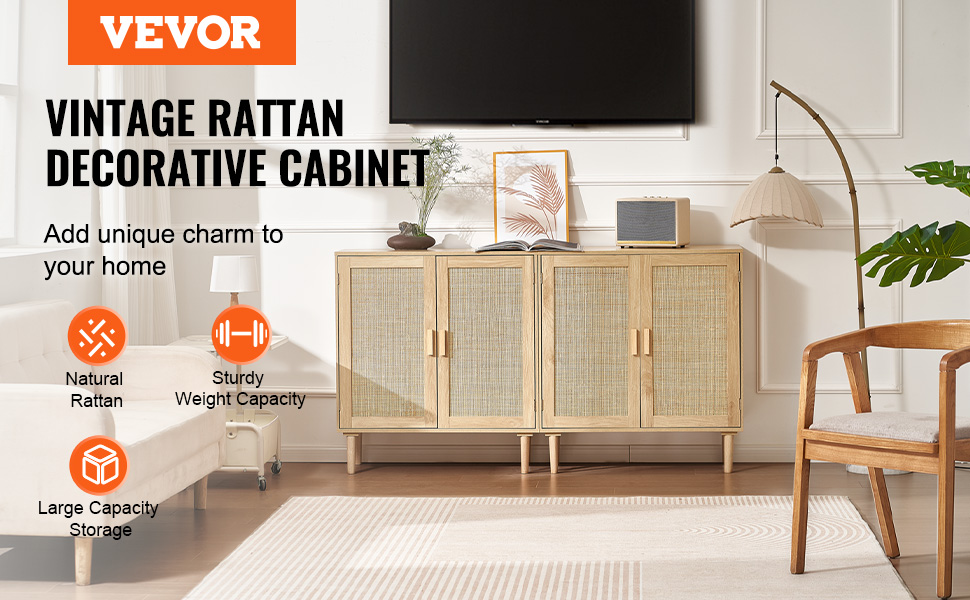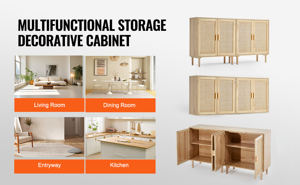 Táto ratanová bufetová skrinka ponúka dokonalé úložné riešenie, vhodné na použitie ako kuchynský príborník, barová skrinka, úložná jednotka alebo skrinka na topánky v predsieni. Vďaka svojmu všestrannému dizajnu sa dá prispôsobiť rôznym prostrediam a slúži ako úložná jednotka aj dekoratívny kúsok.
