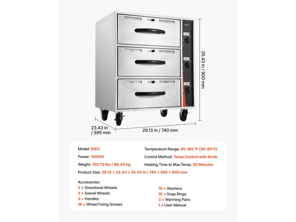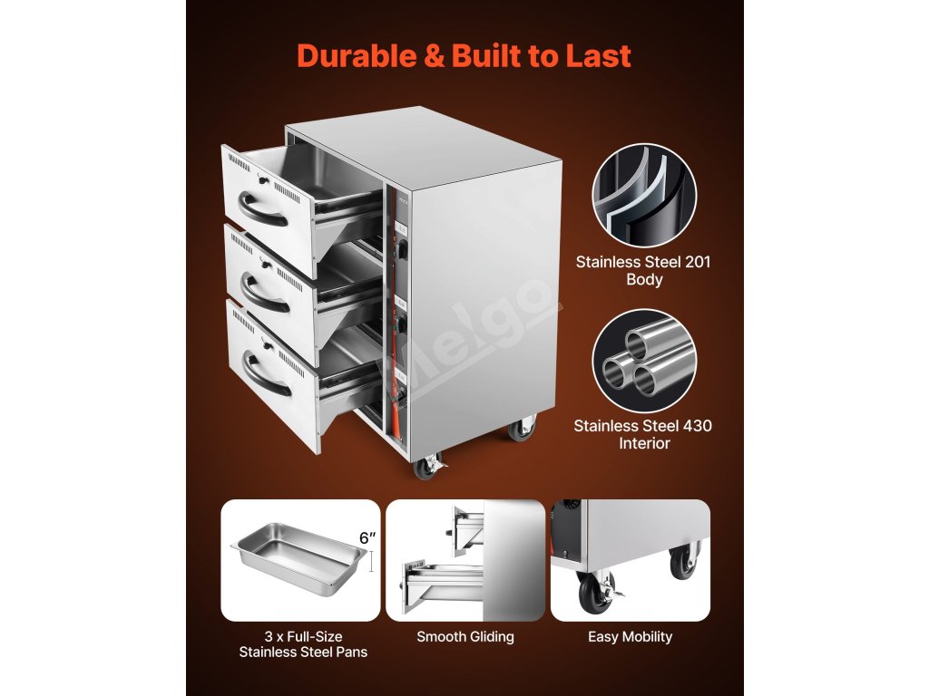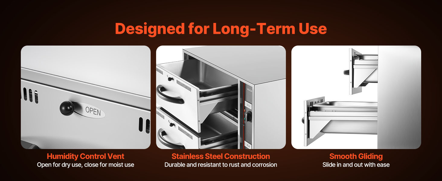 Táto ohrievacia zásuvka je vyrobená z vysokokvalitnej nehrdzavejúcej ocele a je odolná voči korózii. Hladký interiér a ľahko posuvné zásuvky zjednodušujú čistenie a každodenné používanie.