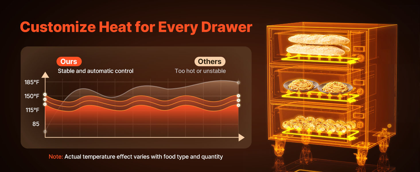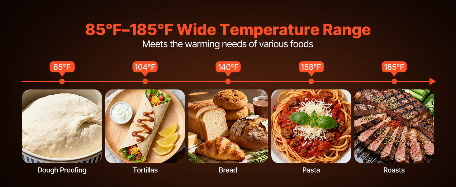 Vďaka rozsahu 85 - 185 °F (30 - 85 °C) táto ohrievacia zásuvka udržiava rôzne druhy potravín pri ideálnej teplote na servírovanie, napríklad chlieb, pečivo, pečenú zeleninu a cestoviny.