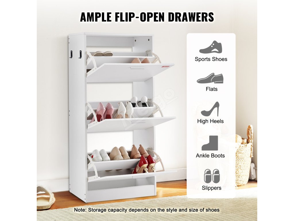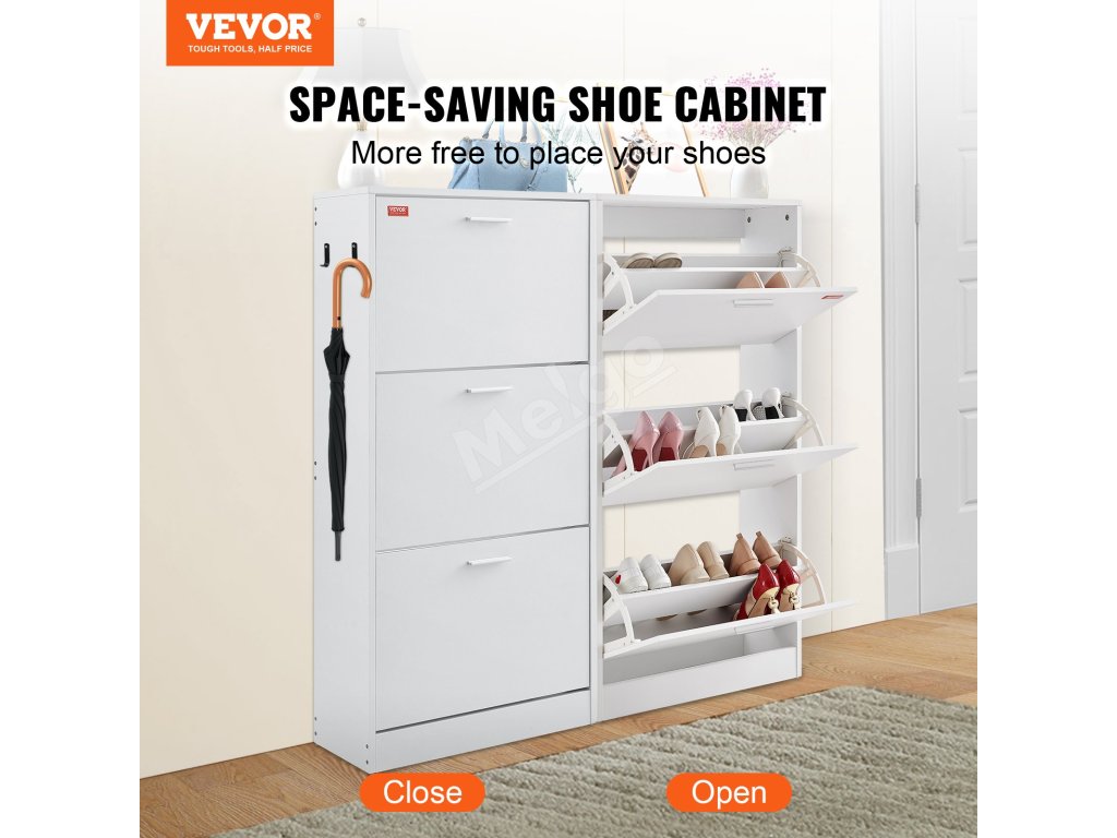 Vďaka inovatívnym priestorovo úsporným výklopným zásuvkám umožňuje naša skrinka na topánky ľahký prístup k rôznym topánkam a zároveň ich úhľadne usporiada, keď sa nepoužívajú, čím zabezpečuje uprataný vstupný priestor.