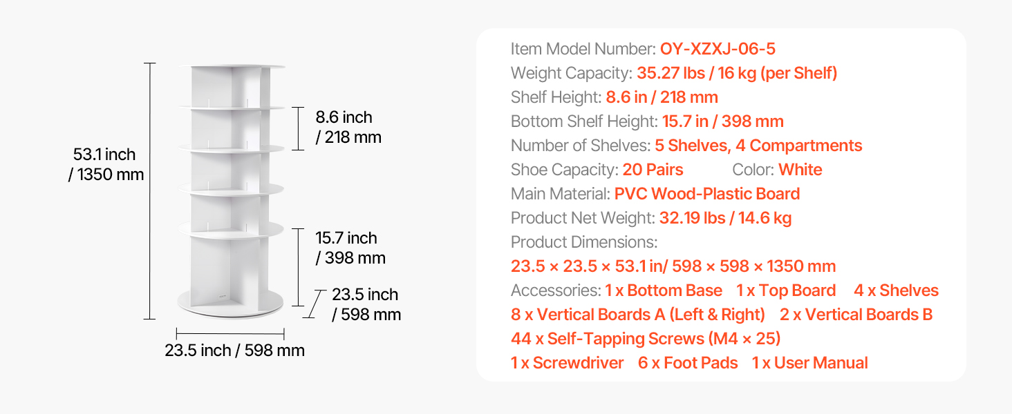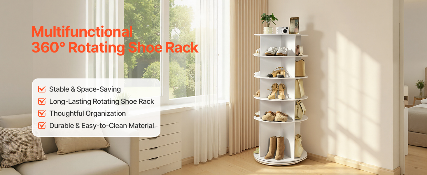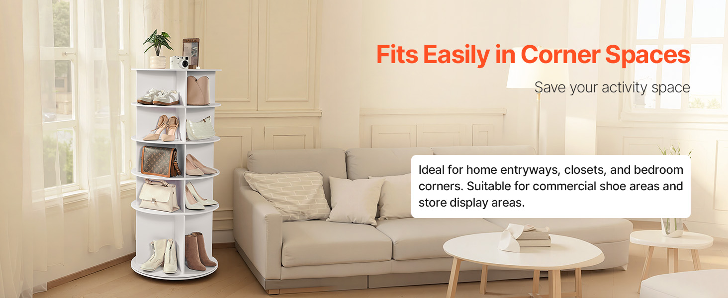 Otočná veža na topánky je vyrobená v okrúhlom/valcovitom dizajne s malými rozmermi, takže sa zmestí aj do kompaktných priestorov, napríklad do rohov. Okrem ukladania topánok sa do nej dajú uložiť aj tašky, klobúky, šatky, CD, knihy, rastliny v kvetináčoch atď. Ideálny na domáce skladovanie a vystavenie v obchode.