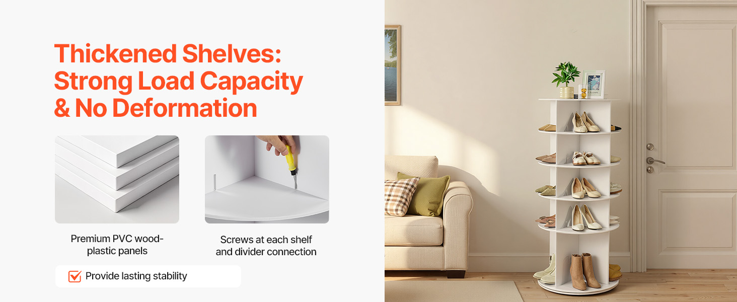 Náš rotujúci organizér na topánky má plastové panely z PVC dreva so zosilnenými policami; každá vrstva unesie až 35 kg bez ohýbania. Panely sú pevne pripevnené pomocou skrutiek, aby sa počas otáčania nešmýkali. Dokáže zostať stabilný a odolný pri každodennom vysokofrekvenčnom používaní.