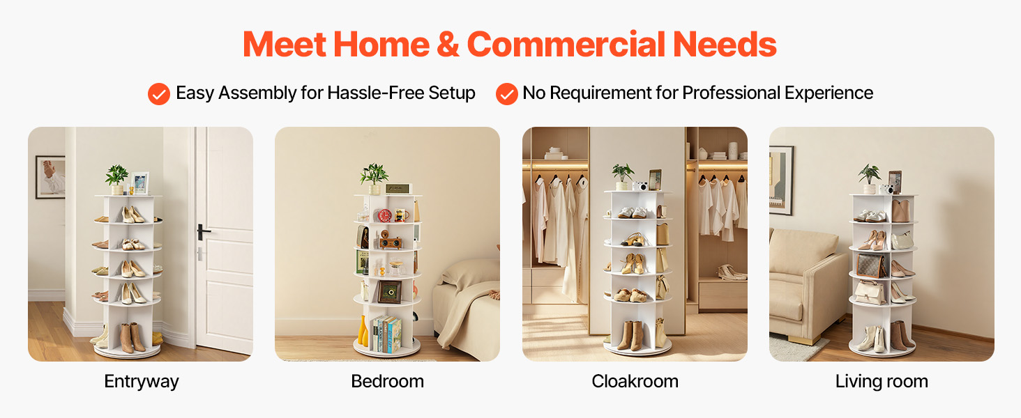 Vďaka minimalistickému vzhľadu a 2 klasickým farebným variantom sa otočná veža na topánky hodí do domácich predsiení, šatníkov, rohov spální, ako aj do priestorov obchodov s obuvou a výstavných zón obchodných centier - kombinuje úložný priestor a dekoráciu. Vrátane ilustrovaného návodu a kompletného príslušenstva sa ľahko inštaluje.