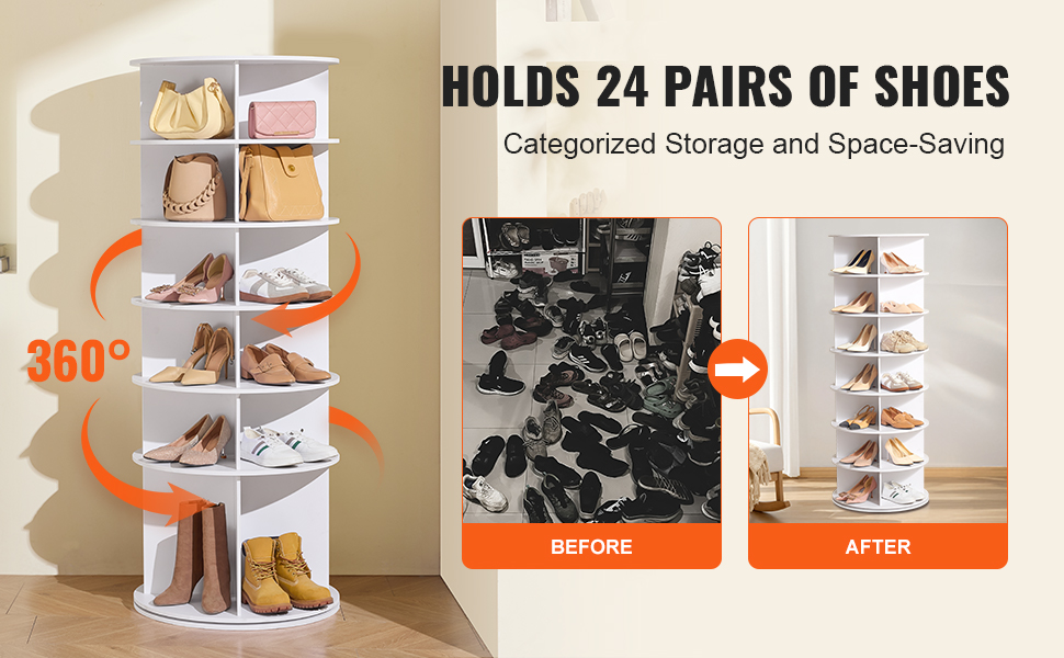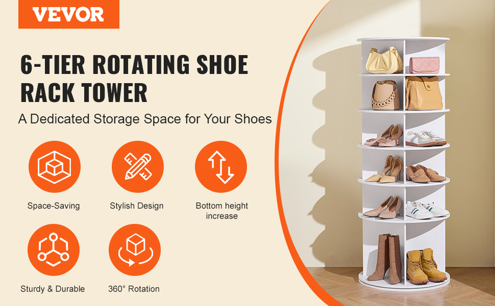 Tento otočný stojan na topánky vám pomôže udržať topánky v dokonalom poriadku, pretože sa otáča o 360° a umožňuje ľahký prístup ku každému páru. Vďaka viacúrovňovému dizajnu šetrí miesto a udržiava poriadok vo vašej domácnosti. Už nikdy nebudete mať problém nájsť svoje obľúbené topánky!