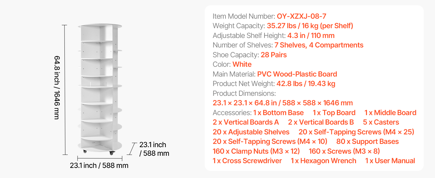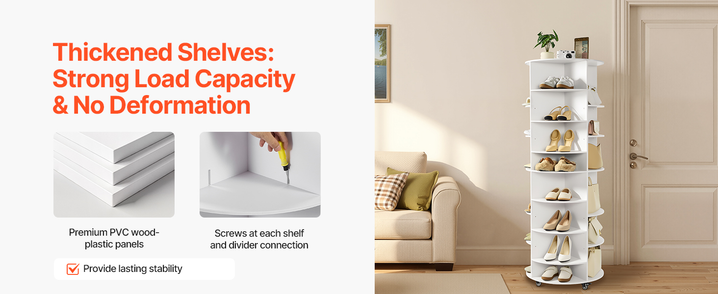 Náš rotujúci organizér na topánky má plastové panely z PVC dreva s nastaviteľnými policami; každá vrstva unesie až 35 kg bez ohýbania. Panely sú pevne pripevnené pomocou skrutiek, aby sa počas otáčania nešmýkali. Je stabilný a dlhotrvajúci na každodenné používanie, dodáva sa aj s uzamykateľnými kolieskami na jednoduchý presun.