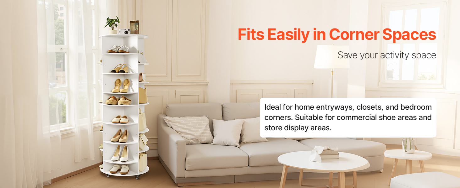 Otočná veža na topánky je vyrobená v okrúhlom/valcovom dizajne s malými rozmermi, takže sa zmestí aj do kompaktných priestorov, napríklad do rohov. Okrem ukladania topánok sa do nej dajú uložiť aj tašky, klobúky, šatky, CD, knihy, rastliny v kvetináčoch atď. Ideálny na domáce skladovanie a vystavenie v obchode.
