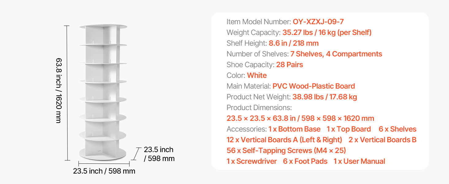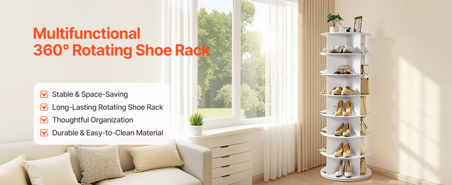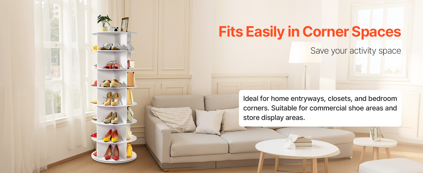 Otočná veža na topánky je vyrobená v okrúhlom/valcovitom dizajne s malými rozmermi, takže sa zmestí aj do kompaktných priestorov, napríklad do rohov. Okrem ukladania topánok sa do nej dajú uložiť aj tašky, klobúky, šatky, CD, knihy, rastliny v kvetináčoch atď. Ideálny na domáce skladovanie a vystavenie v obchode.