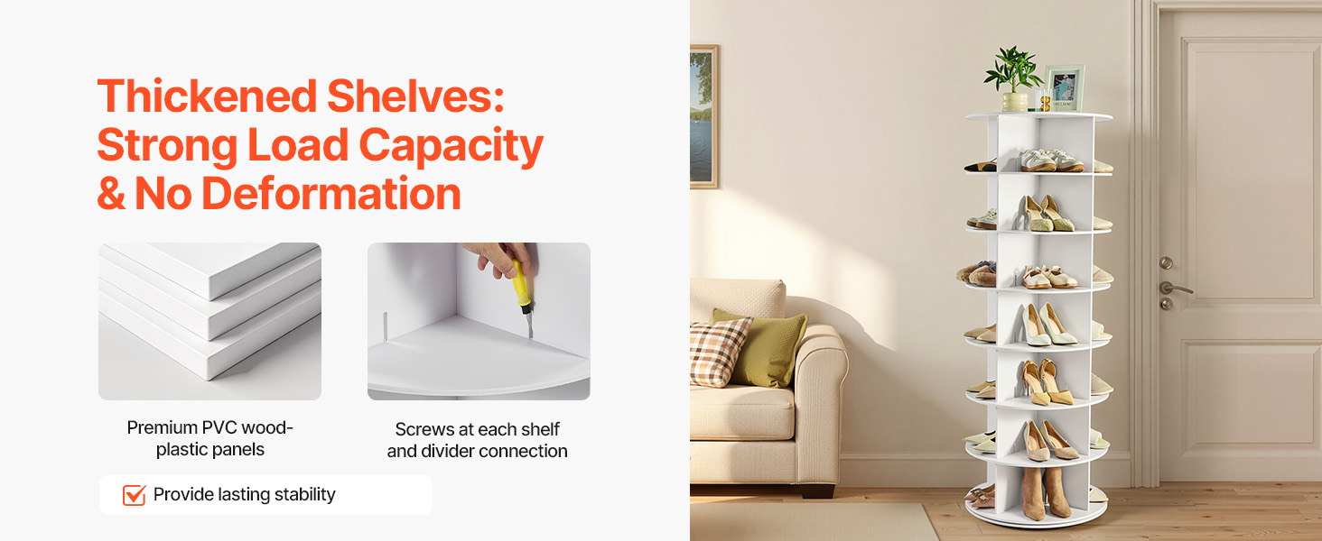 Náš rotujúci organizér na topánky má plastové panely z PVC dreva so zosilnenými policami; každá vrstva unesie až 35 kg bez ohýbania. Panely sú pevne pripevnené pomocou skrutiek, aby sa počas otáčania nešmýkali. Dokáže zostať stabilný a odolný pri každodennom vysokofrekvenčnom používaní.