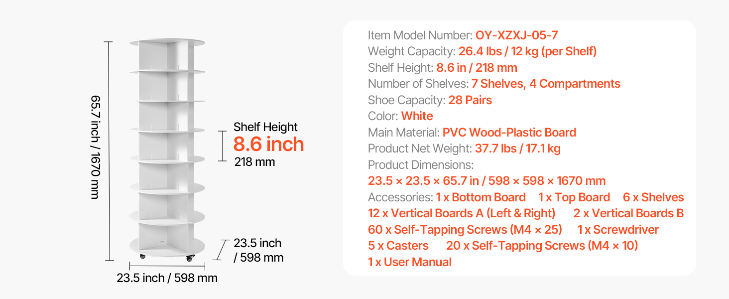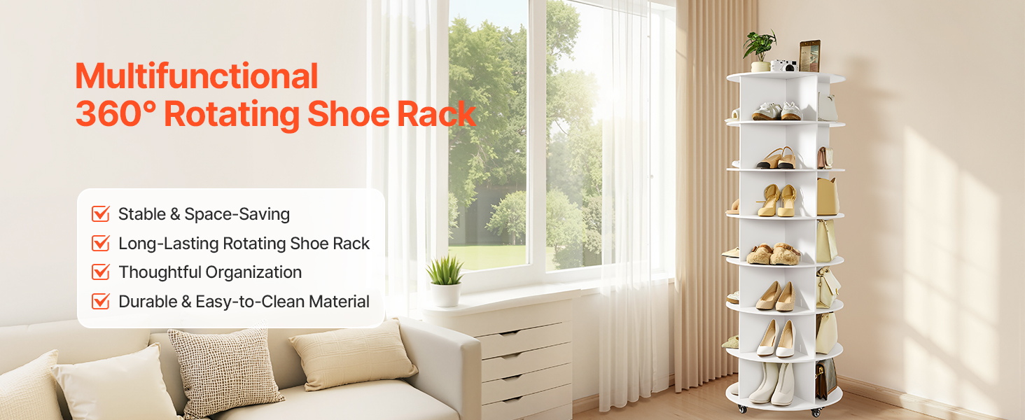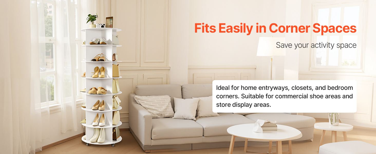 Otočná veža na topánky je vyrobená v okrúhlom/valcovom dizajne s malými rozmermi, takže sa zmestí aj do kompaktných priestorov, napríklad do rohov. Okrem ukladania topánok sa do nej dajú uložiť aj tašky, klobúky, šatky, CD, knihy, rastliny v kvetináčoch atď. Ideálny na domáce skladovanie a vystavenie v obchode.