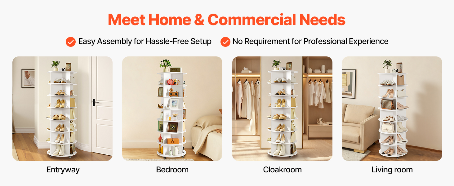Vďaka minimalistickému vzhľadu a 2 klasickým farebným variantom sa otočná veža na topánky hodí do domácich predsiení, šatníkov, rohov spální, ako aj do priestorov obchodov s obuvou a výstavných zón obchodných centier - kombinuje úložný priestor a dekoráciu. Vrátane ilustrovaného návodu a kompletného príslušenstva sa ľahko inštaluje.