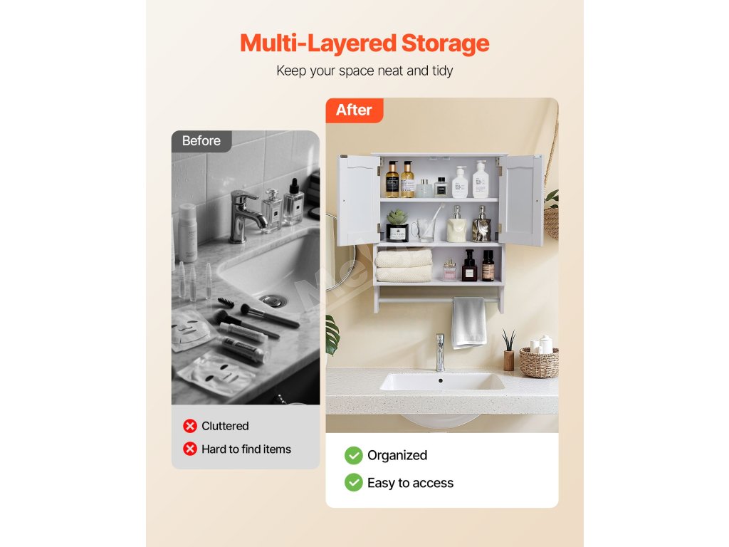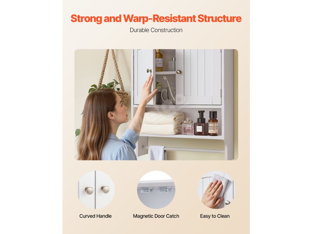 Naša závesná kúpeľňová skrinka má pevný a odolný rám z drevotrieskových dosiek s hladkým magnetickým zatváraním. Pohodlné úchyty a hladké hrany uľahčujú otváranie a zabraňujú nárazom. Odnímateľná tyč na uteráky udržiava čistotu s praktickosťou a ľudskosťou.