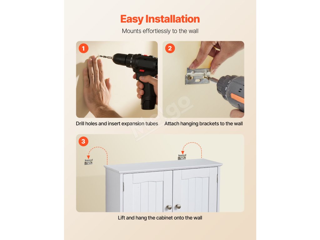 Táto nástenná kúpeľňová skrinka má bezpečnú a stabilnú montážnu konštrukciu, je doplnená podrobným návodom na použitie a kompletnou sadou náradia. Na jednoduchú inštaláciu nie sú potrebné žiadne zložité operácie. Skrinku môžete rýchlo namontovať na stenu, či už ide o začiatočníka alebo neprofesionála.