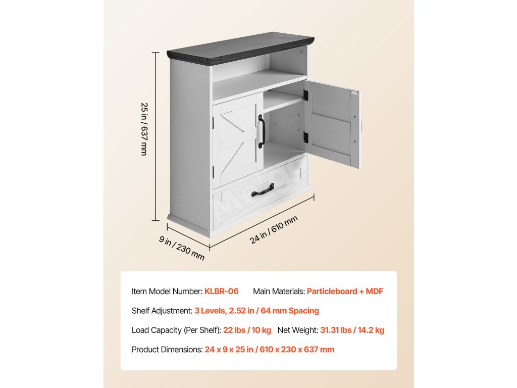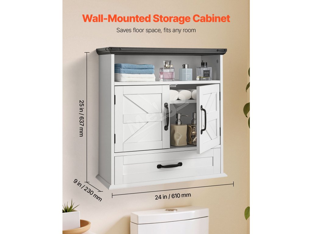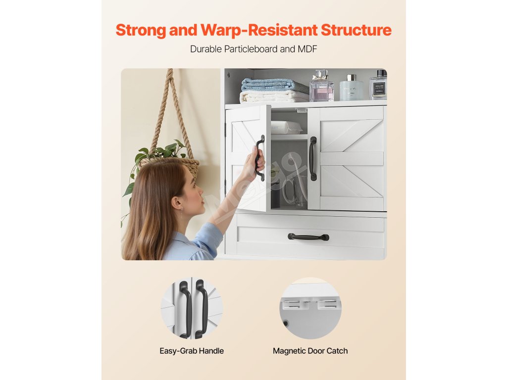Naša závesná kúpeľňová skrinka má pevný a odolný rám z drevotrieskových dosiek s hladkým magnetickým zatváraním. Pohodlné úchyty a hladké hrany uľahčujú otváranie a zabraňujú nárazom. Polička s hrúbkou 0,6 palca poskytuje silnú nosnosť, zostáva dlhodobo pevná a atraktívna.