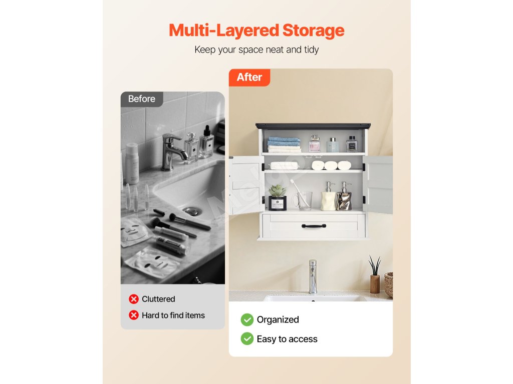 Táto multifunkčná kúpeľňová nástenná skrinka sa bez problémov začlení do kúpeľní, kuchýň, spální, obývacích izieb, chodieb a iných obytných priestorov. Flexibilne sa prispôsobí na ukladanie toaletných potrieb, kuchynských šanónov, organizovanie neporiadku v spálni alebo zdobenie stien obývacej izby.