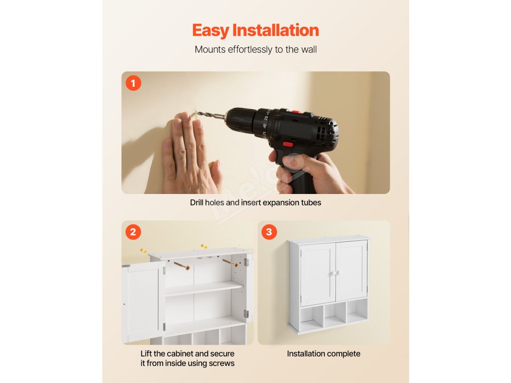 Táto nástenná kúpeľňová skrinka má bezpečnú a stabilnú montážnu konštrukciu, je doplnená podrobným návodom na použitie a kompletnou sadou náradia. Na jednoduchú inštaláciu nie sú potrebné žiadne zložité operácie. Skrinku môžete rýchlo namontovať na stenu, či už ide o začiatočníka alebo neprofesionála.