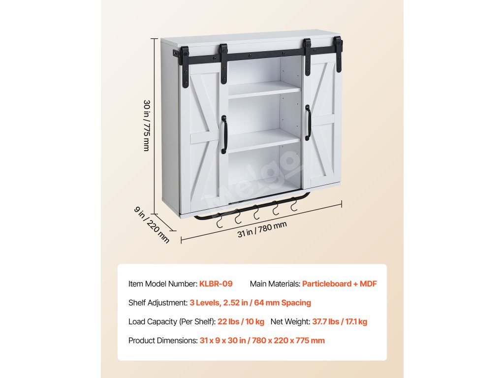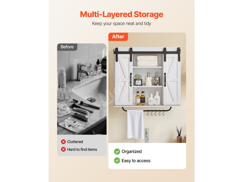 Naša závesná kúpeľňová skrinka má pevný a odolný rám z drevotrieskových dosiek s hladkým magnetickým zatváraním. Pohodlné úchyty a hladké hrany uľahčujú otváranie a zabraňujú nárazom. Jej odnímateľná tyč na uteráky na čistotu s 5 S-háčikmi na jednoduché zavesenie drobných predmetov.