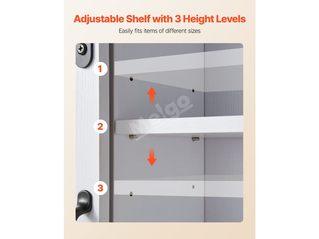 Táto nástenná skrinka do kúpeľne je vyrobená z prvotriednej drevotriesky, je robustná, odolná a atraktívna. Jej priestranný interiér s 3-úrovňovou nastaviteľnou policou maximalizuje vertikálny úložný priestor. Naša kúpeľňová nástenná skrinka spĺňa potreby na uskladnenie rôznych toaletných potrieb a rôznych predmetov.