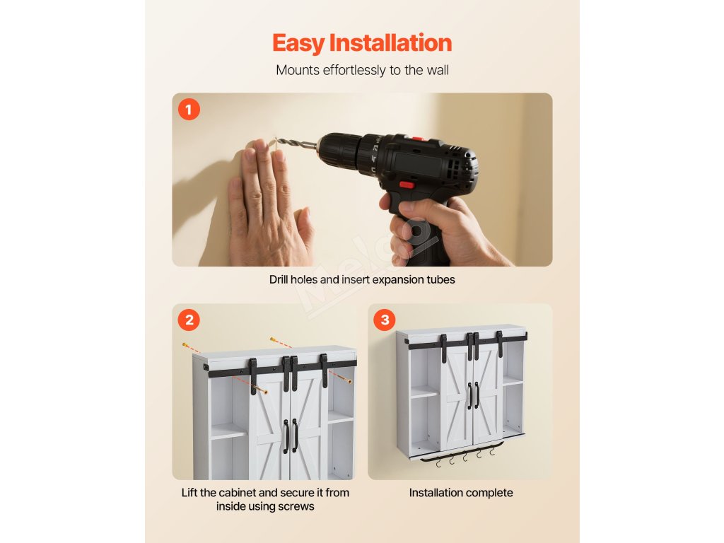 Táto nástenná kúpeľňová skrinka má bezpečnú a stabilnú montážnu konštrukciu, je doplnená podrobným návodom na použitie a kompletnou sadou náradia. Na jednoduchú inštaláciu nie sú potrebné žiadne zložité operácie. Skrinku môžete rýchlo namontovať na stenu, či už ide o začiatočníka alebo neprofesionála.