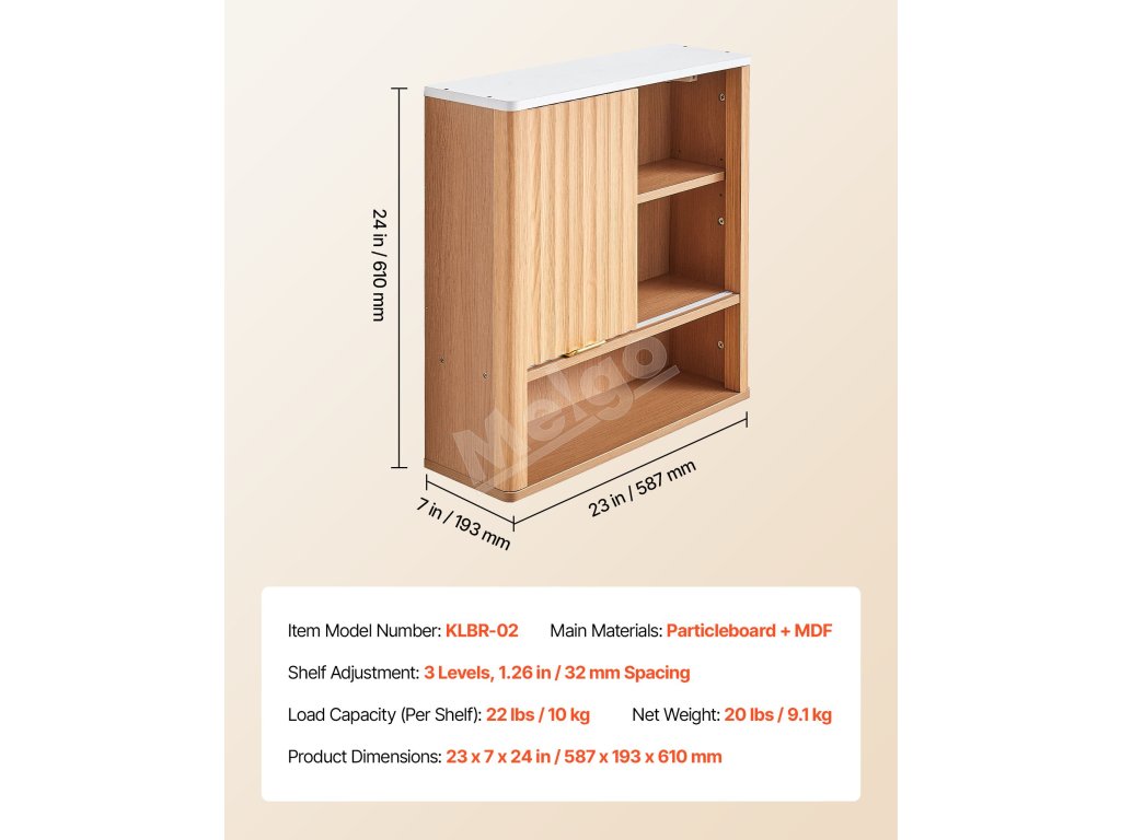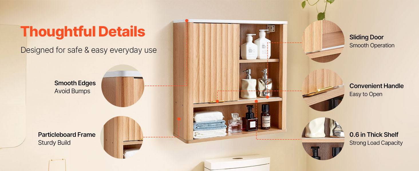 Naša závesná kúpeľňová skrinka má pevný a odolný rám z drevotrieskových dosiek s hladkým magnetickým zatváraním. Pohodlné úchyty a hladké hrany uľahčujú otváranie a zabraňujú nárazom. Polička s hrúbkou 0,6 palca poskytuje silnú nosnosť, zostáva dlhodobo pevná a atraktívna.