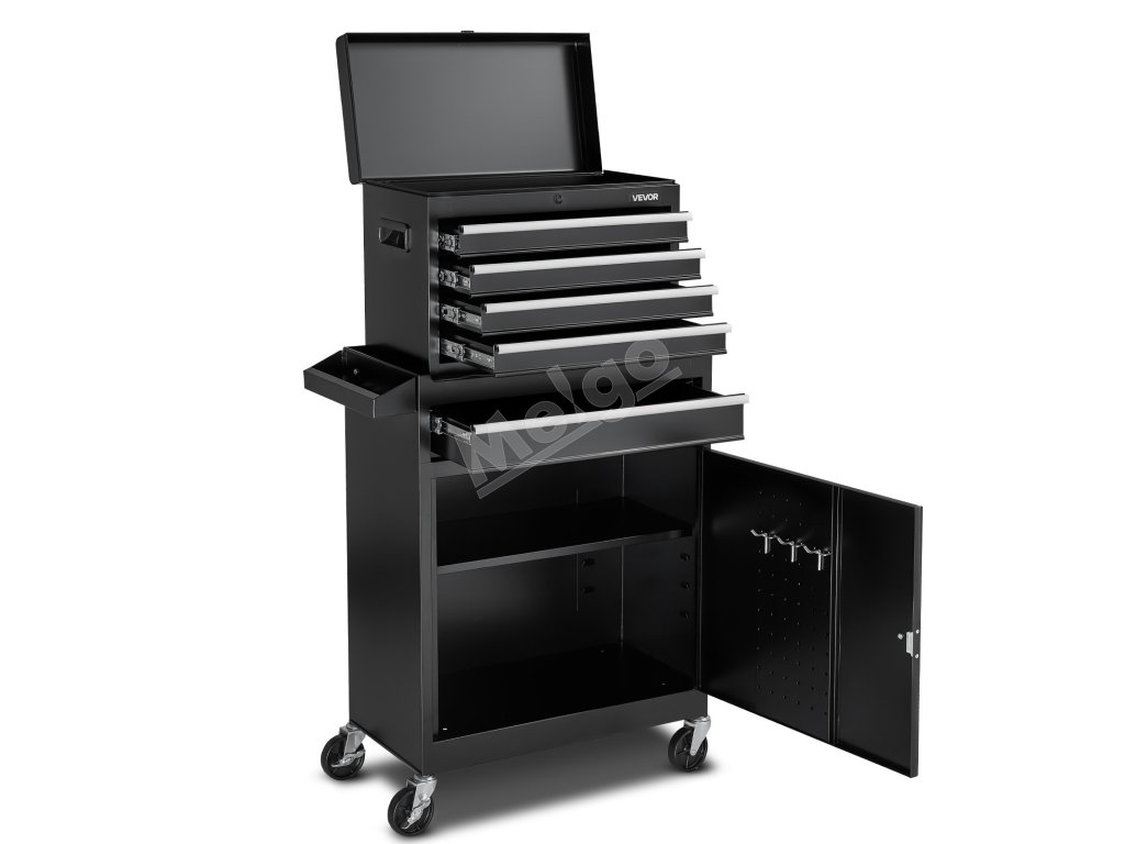 Táto pojazdná skrinka na náradie kombinuje hornú priehradku, štvorzásuvkovú skrinku na náradie, pohyblivú spodnú skrinku, tri pozinkované háčiky a bočné držadlo so stojanom na náradie. Vo viacerých zásuvkách je náradie uložené podľa kategórií a bočné háčiky s hornou priehradkou rozširujú úložný priestor. Ideálne na organizáciu náradia.