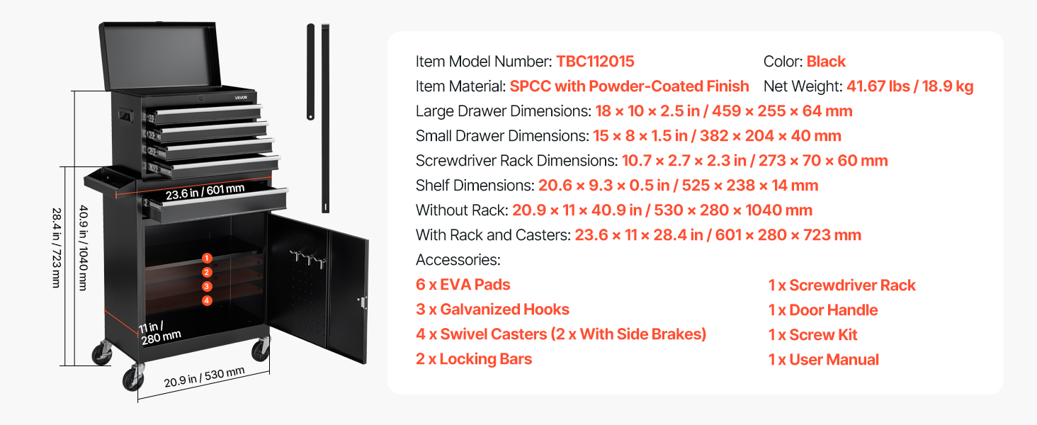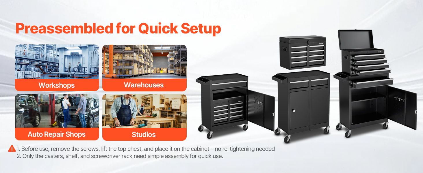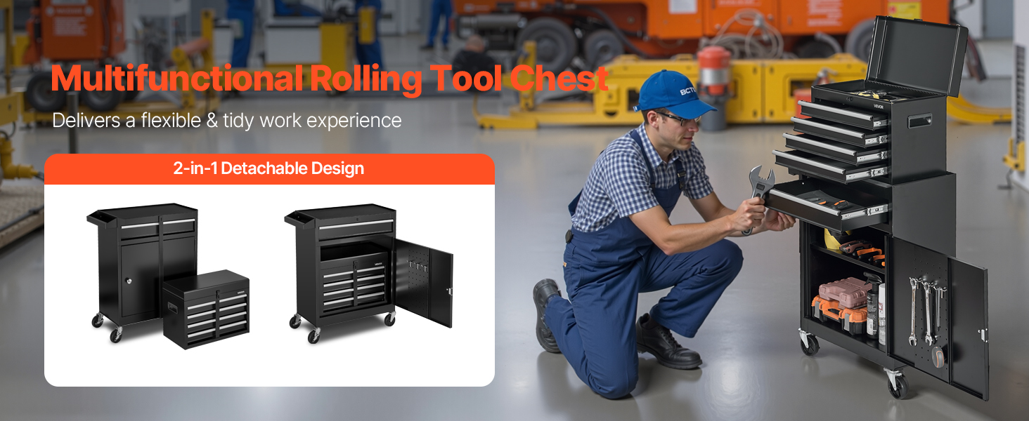 Túto pojazdnú komodu na náradie možno rozložiť na štvorzásuvkovú komodu na náradie a pohyblivú skrinku. Kombinácia hornej priehradky, zásuvkového boxu, spodnej skrinky s kolieskami a bočného regálu na náradie je navrhnutá tak, aby poskytovala dostatočný úložný priestor pre rôzne náradie a pohodlný prístup pre vás.