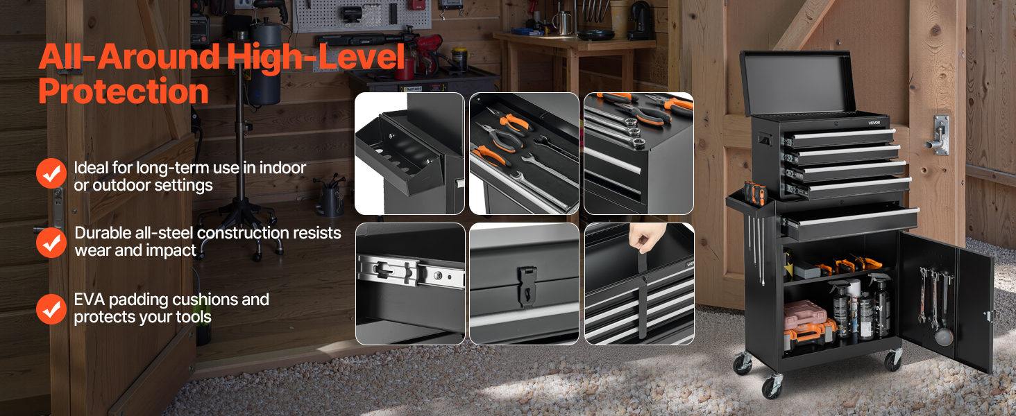 Náš stojanový box na náradie, vyrobený z odolnej ocele valcovanej za studena s práškovou povrchovou úpravou, odoláva korózii, hrdzi a opotrebovaniu. Zabudované polstrovanie EVA v pracovnom stole a zásuvkách dokáže izolovať teplo a tlmiť náradie, aby sa zabránilo vibráciám a hluku, predlžuje životnosť náradia a skrinky na náradie.