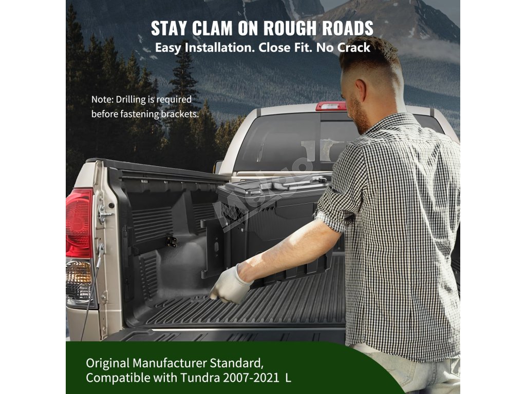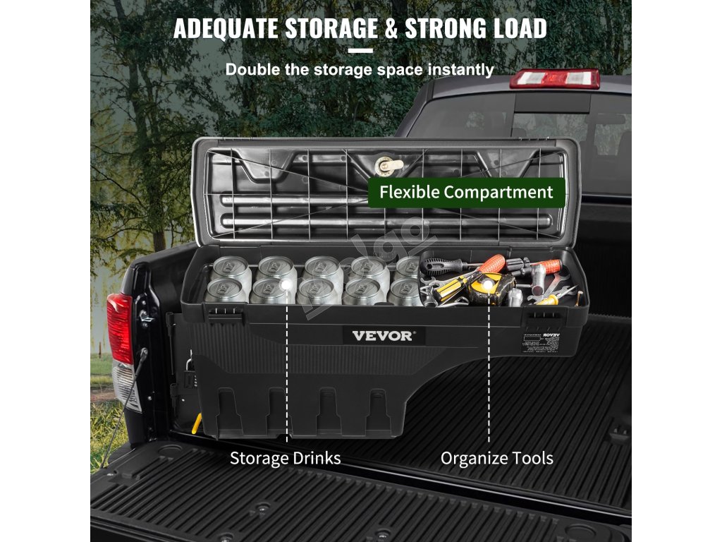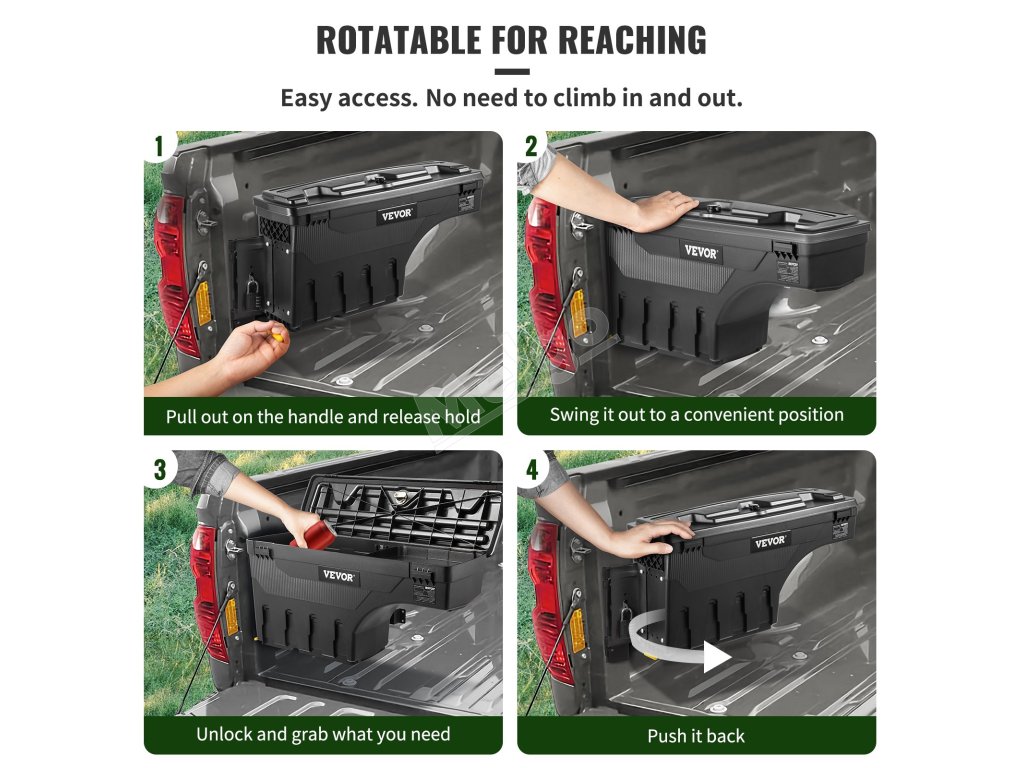 Úložný box v lôžku nákladného vozidla môžete umiestniť na stranu vodiča alebo spolujazdca, čím získate dostatok priestoru pre potreby vašej cesty. Pohodlne sa vysúva a zasúva. Nie je potrebné liezť do lôžka, ako to vyžaduje väčšina boxov.