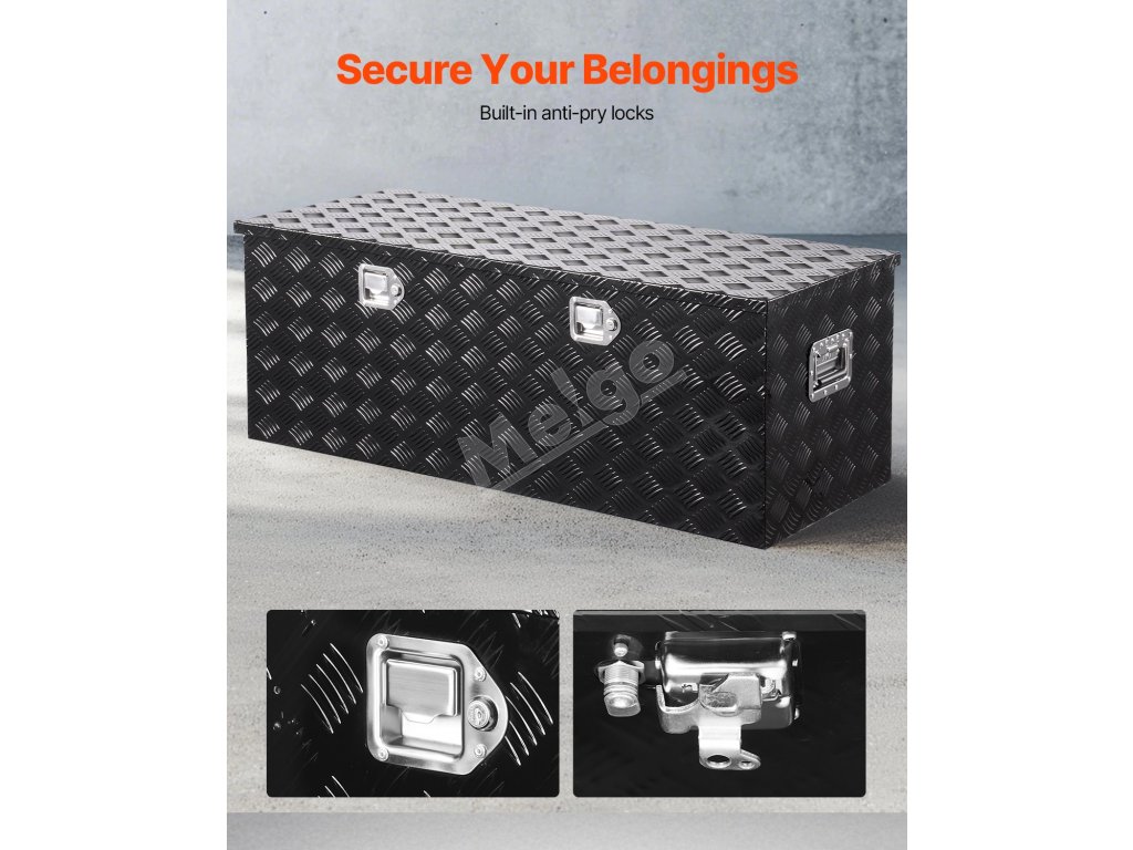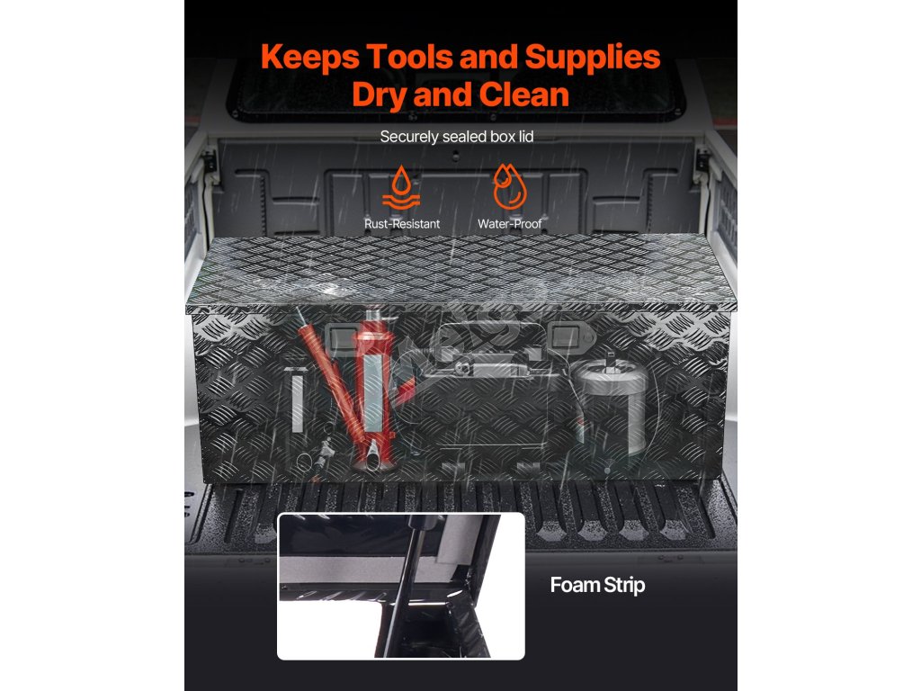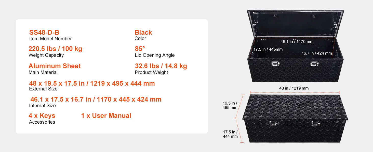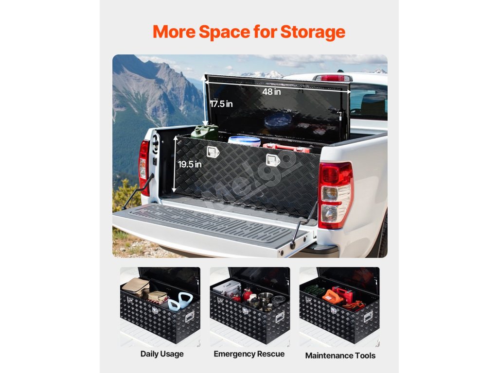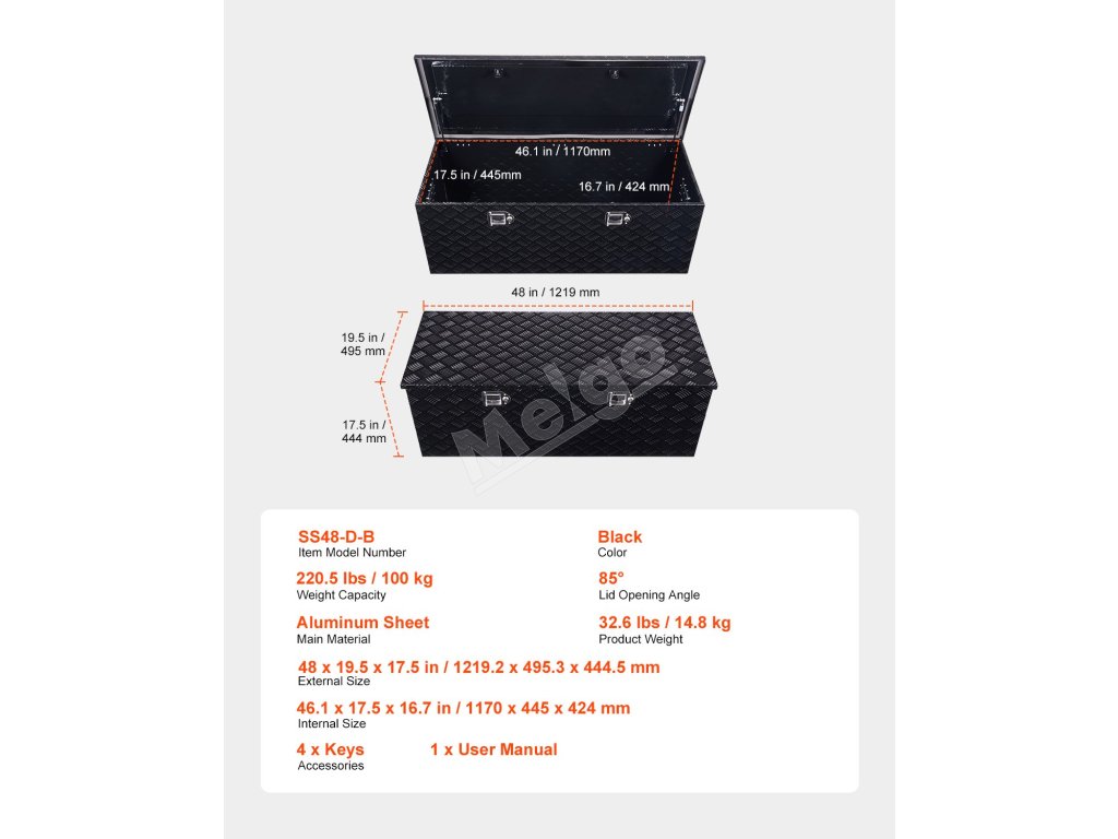 Tento box na náradie do lôžka nákladného vozidla má vnútornú kapacitu na uloženie predmetov s dĺžkou až 46,1" (1170 mm), šírkou 17,5" (445 mm) a výškou 16,7" (424 mm). Unesie hmotnosť 220,5 lbs (100 kg), čo vám umožní uložiť predmety, ako je zdvihák, rôzne náradie vo vozidle, skladacie stany, batožina a ďalšie.