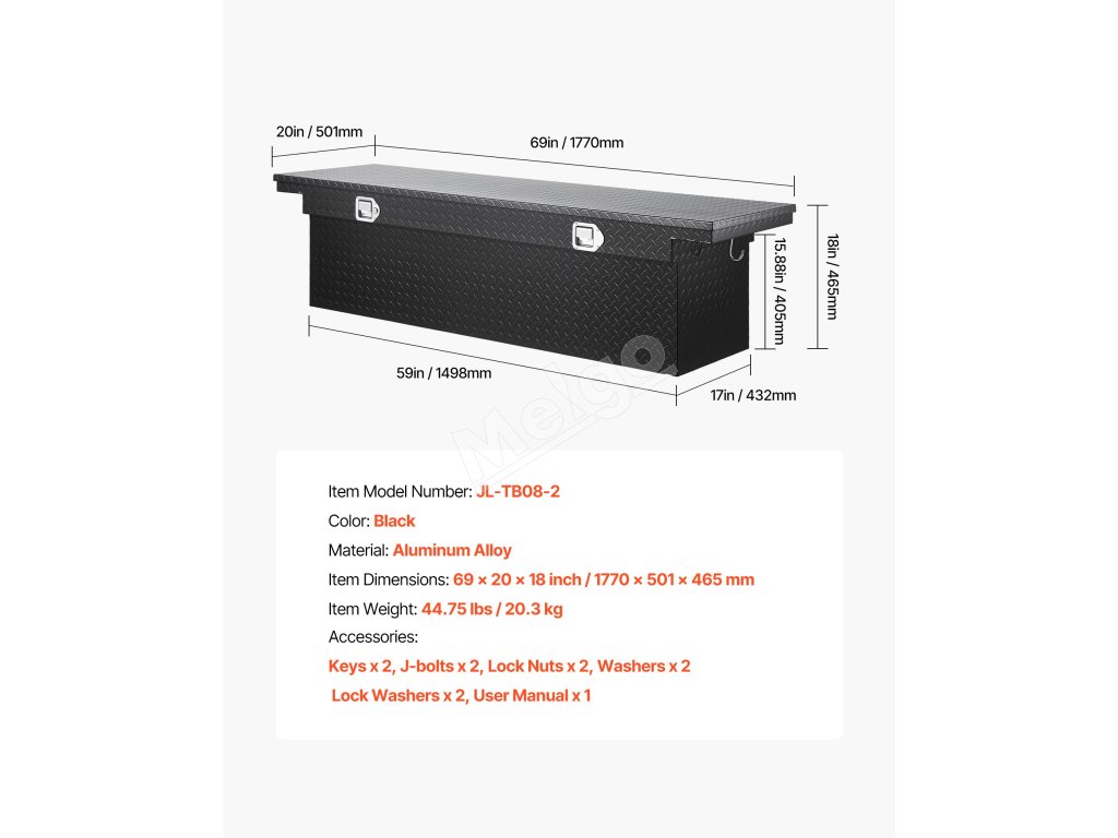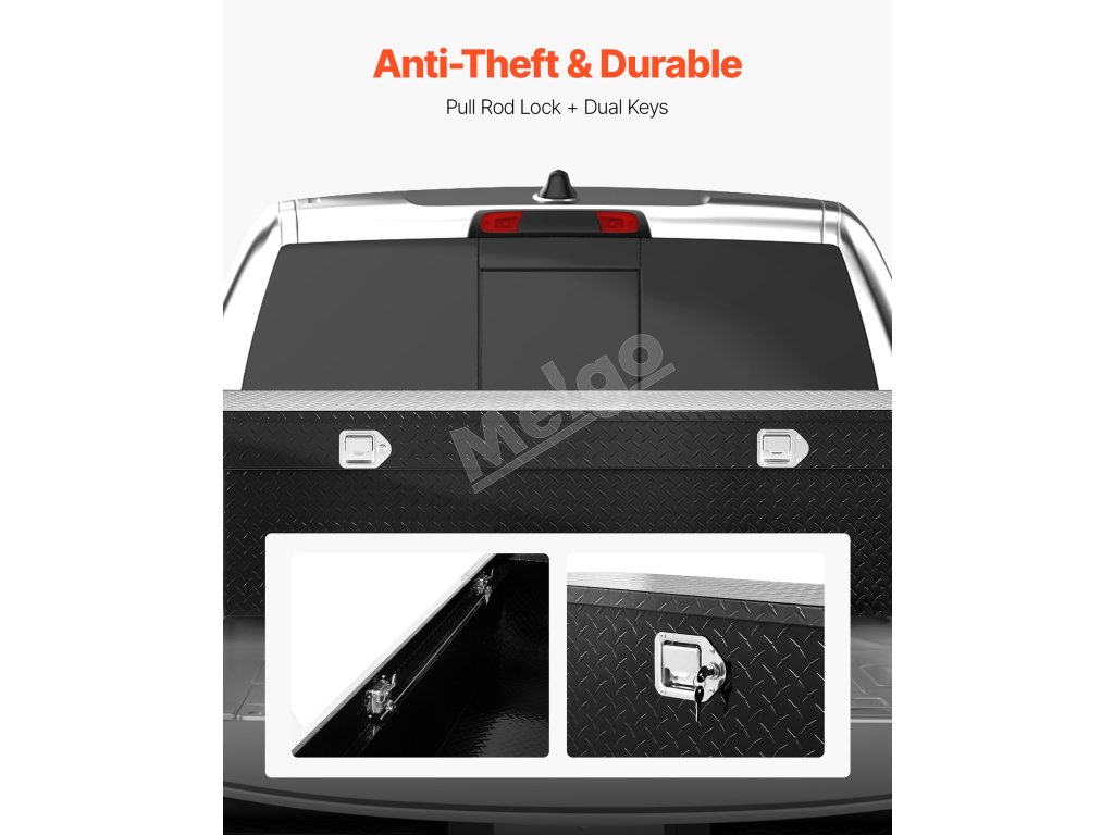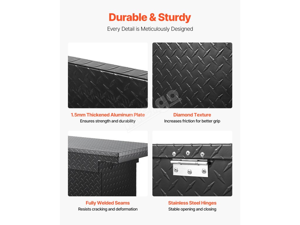 Tento box na náradie pre nákladné vozidlá je vyrobený z vysokokvalitného hliníka s hrúbkou 1,5 mm (0,058 palca), je pevný a odolný a unesie až 110 libier (50 kg). Je navrhnutý tak, aby odolal nerovnostiam na cestách, a zaručuje dlhodobú stabilitu a spoľahlivý výkon.