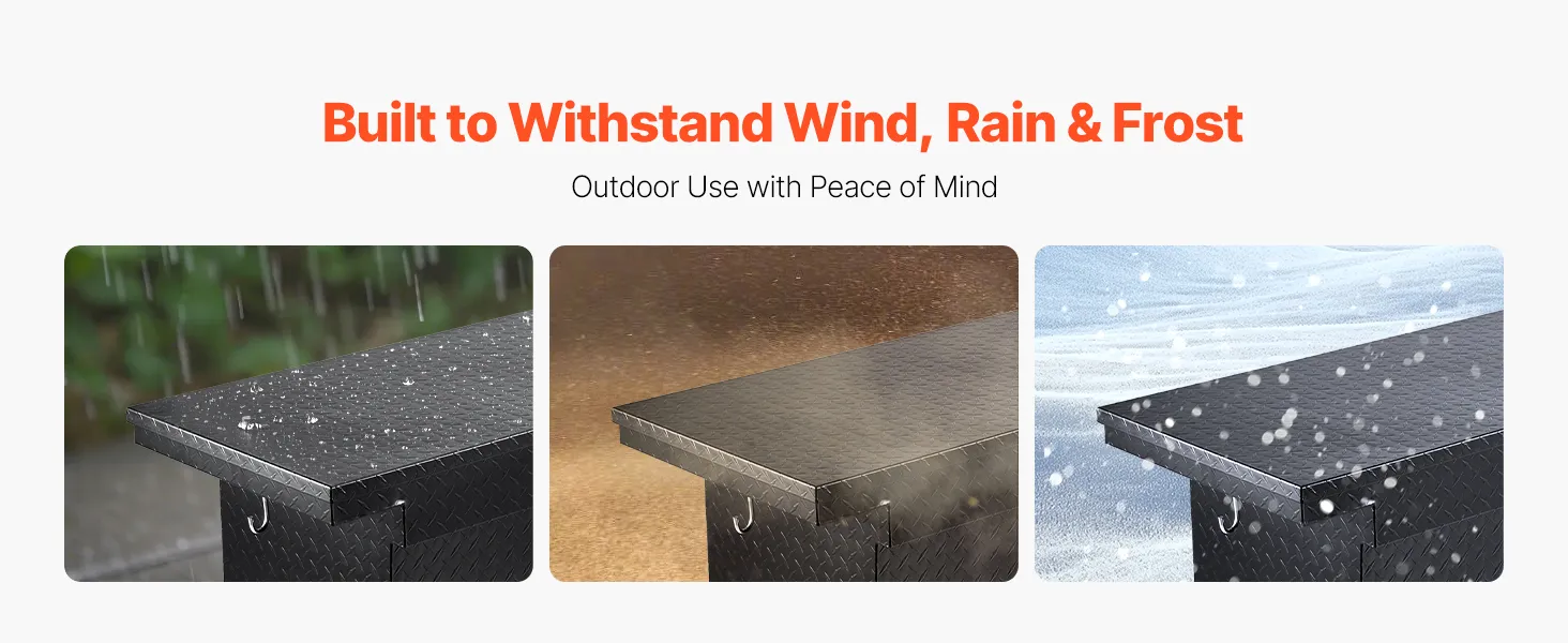 Náš 69-palcový box na náradie pre veľké zaťaženie je vyrobený z hrubého hliníka, ktorý unesie 110 kg. Jeho povrch z diamantového plechu zvyšuje odolnosť, zatiaľ čo konštrukcia odolná voči poveternostným vplyvom odoláva slnku, dažďu, prachu a mrazu. Zámok z nehrdzavejúcej ocele a 100N hydraulické vzpery zabezpečujú bezpečné uloženie a plynulé otváranie veka v uhle 70-90°.