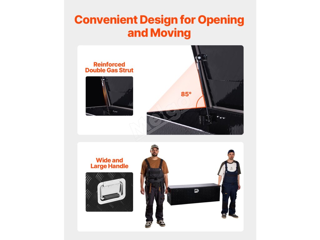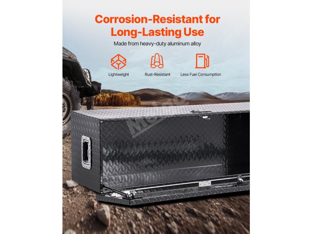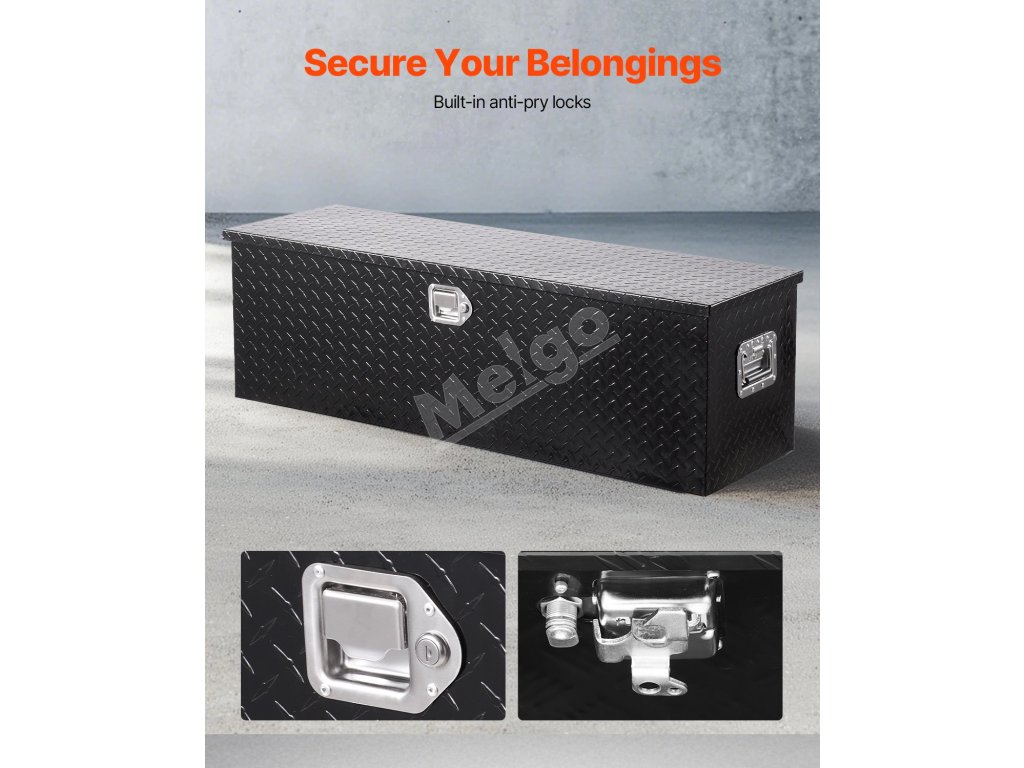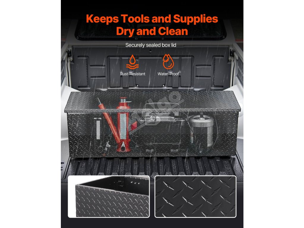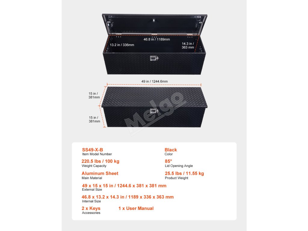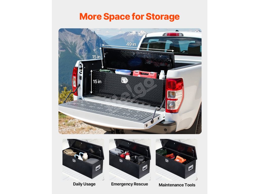 Tento box na náradie do lôžka nákladného vozidla má vnútornú kapacitu na uloženie predmetov s dĺžkou až 46,8" (1189 mm), šírkou 13,2" (336 mm) a výškou 14,3" (363 mm). Unesie hmotnosť 220,5 lbs (100 kg), čo vám umožní uložiť predmety, ako je zdvihák, rôzne náradie vo vozidle, skladacie stany, batožina a ďalšie.