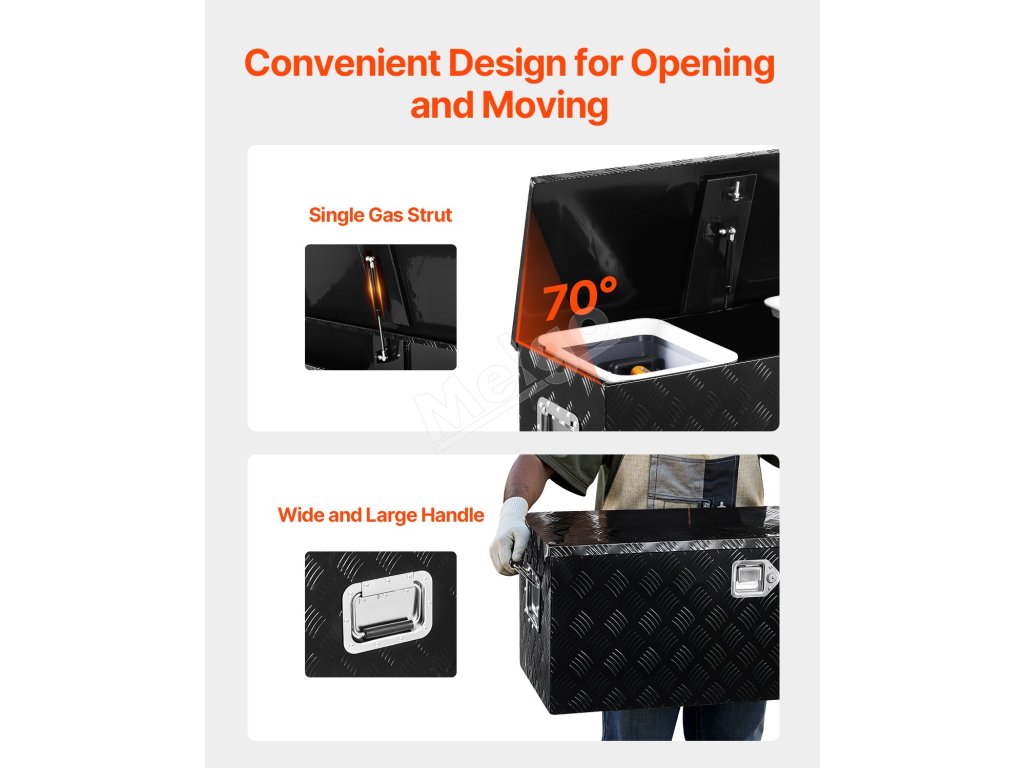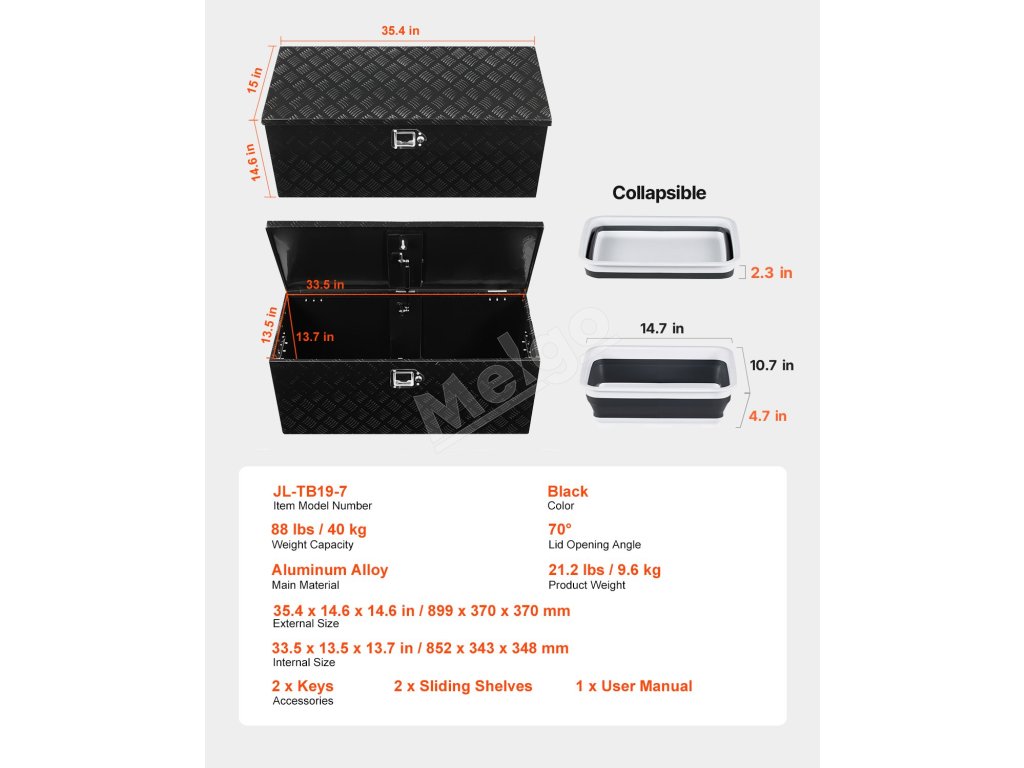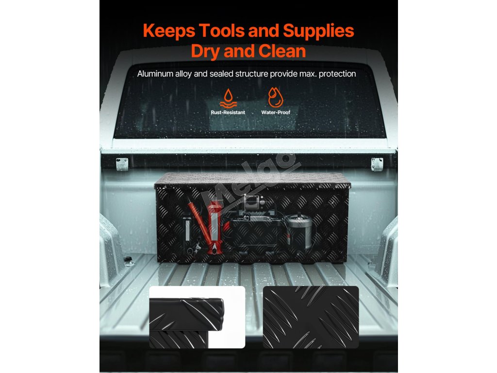 Tento box na náradie v lôžku nákladného vozidla má vnútornú kapacitu na uloženie predmetov s dĺžkou až 33,5" (852 mm), šírkou 13,5" (343 mm) a výškou 13,7" (348 mm). Unesie hmotnosť 88 libier (40 kg), čo vám umožní uložiť predmety, ako je zdvihák, rôzne náradie vo vozidle, skladacie stany, batožina a ďalšie.