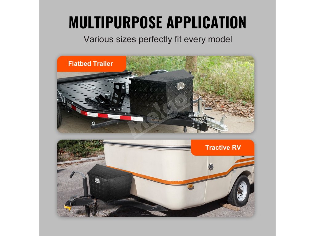 Otvory môžete ľahko vyvŕtať a skrutky a skrutky namontovať sami, čím zabezpečíte bezpečnú a pevnú inštaláciu. Pred nákupom odporúčame zmerať veľkosť vášho prívesu, aby ste si vybrali box na náradie vhodnej veľkosti.