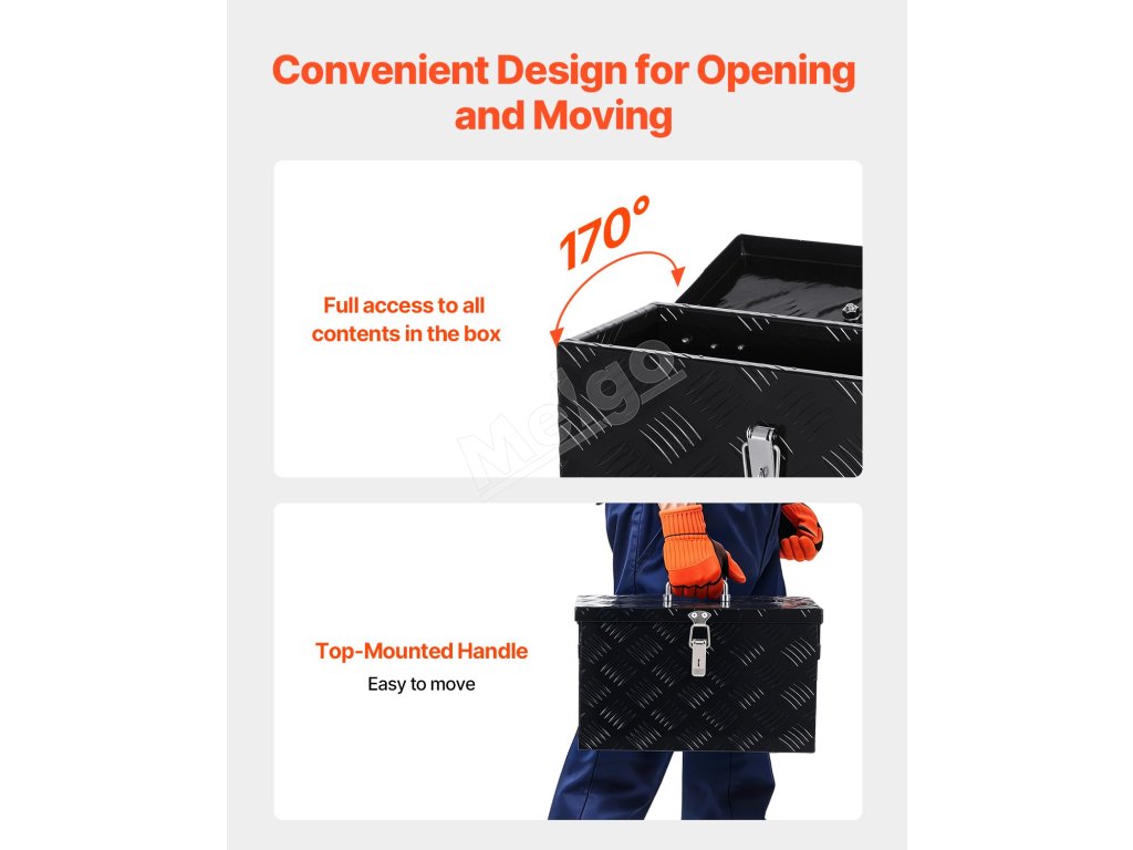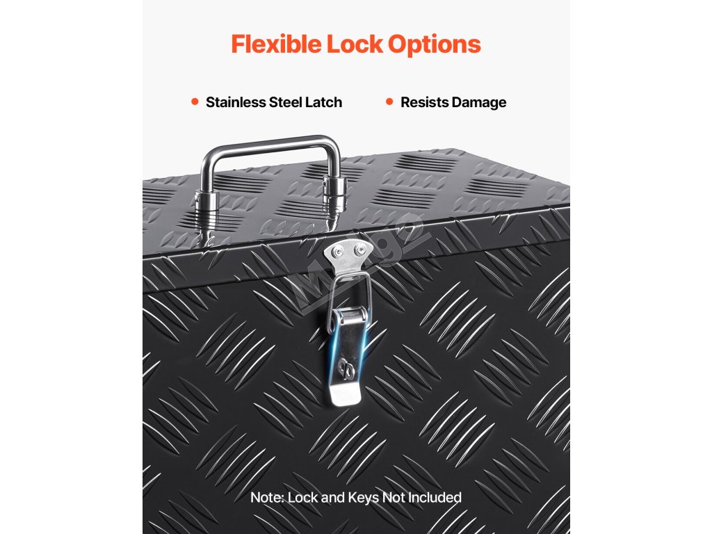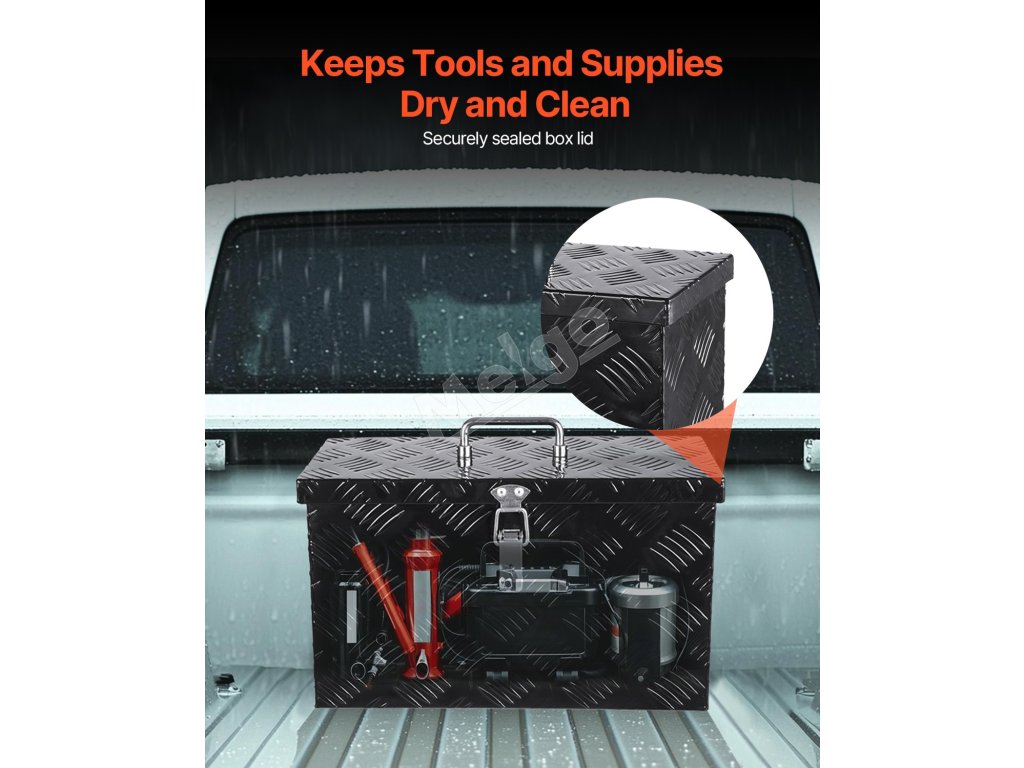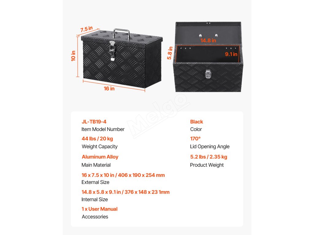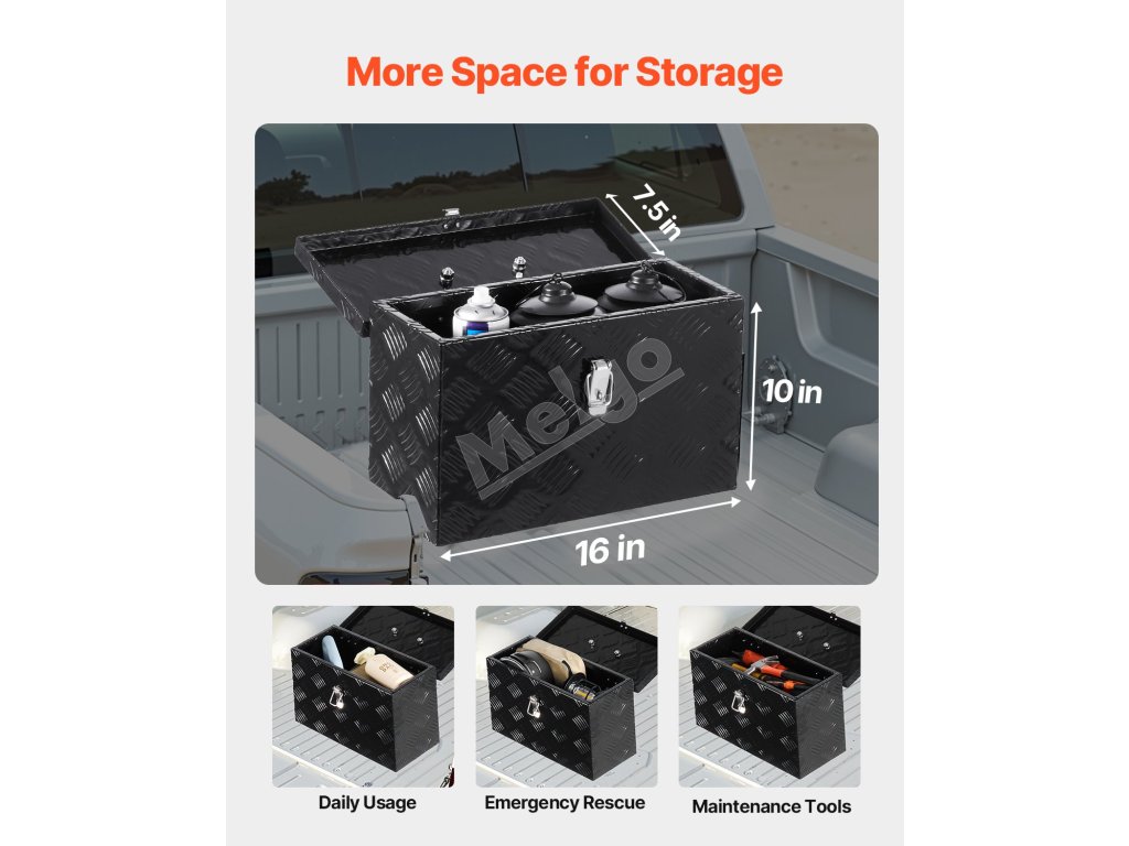 Tento box na náradie do lôžka nákladného vozidla má vnútornú kapacitu na uloženie predmetov s dĺžkou až 14,8" (376 mm), šírkou 5,8" (148 mm) a výškou 9,1" (231 mm). Unesie hmotnosť 44 libier (20 kg), čo vám umožní uložiť predmety, ako je zdvihák, rôzne náradie vo vozidle, skladacie stany, batožina a ďalšie.