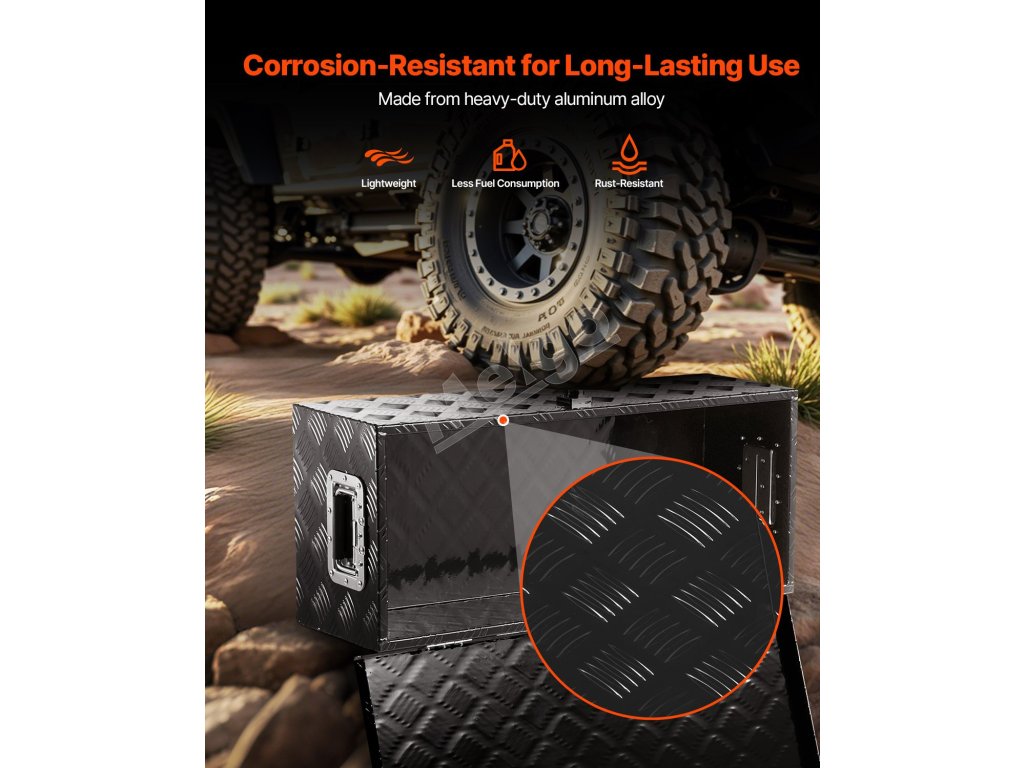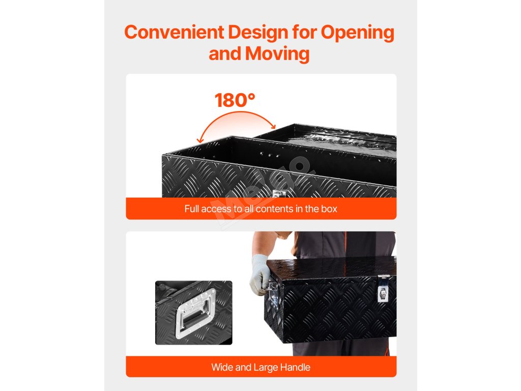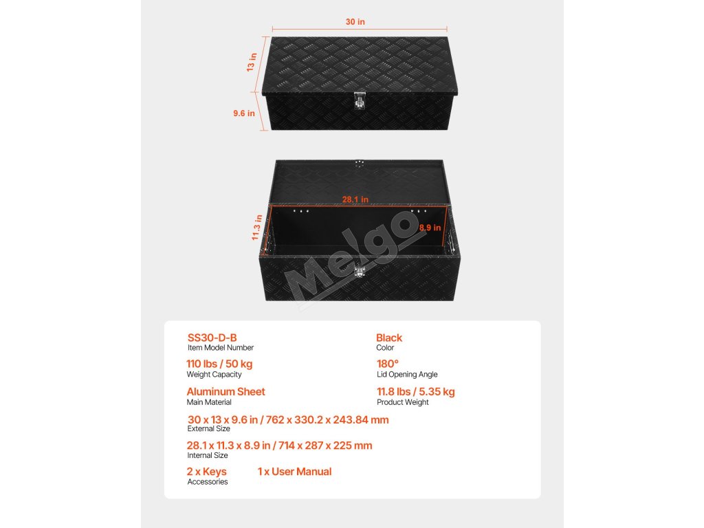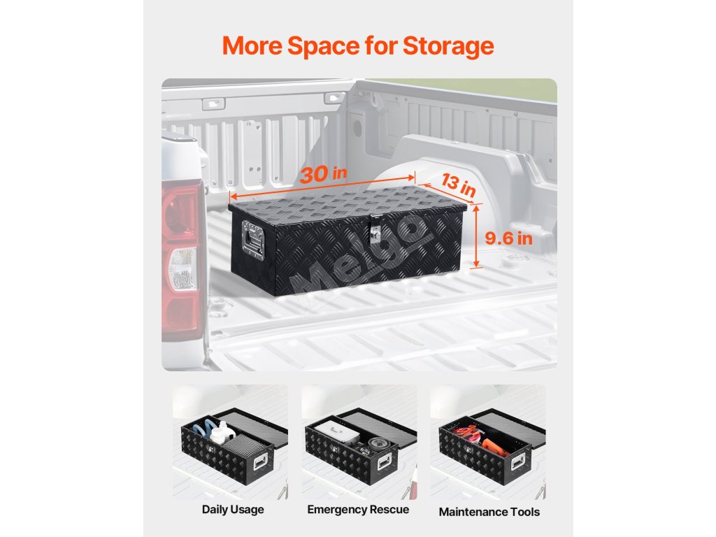 Tento box na náradie do lôžka nákladného vozidla má vnútornú kapacitu na uloženie predmetov s dĺžkou až 28,1" (714 mm), šírkou 11,3" (287 mm) a výškou 8,9" (225 mm). Unesie hmotnosť 110 libier (50 kg), čo vám umožní uložiť predmety, ako je zdvihák, rôzne náradie vo vozidle, skladacie stany, batožina a ďalšie.