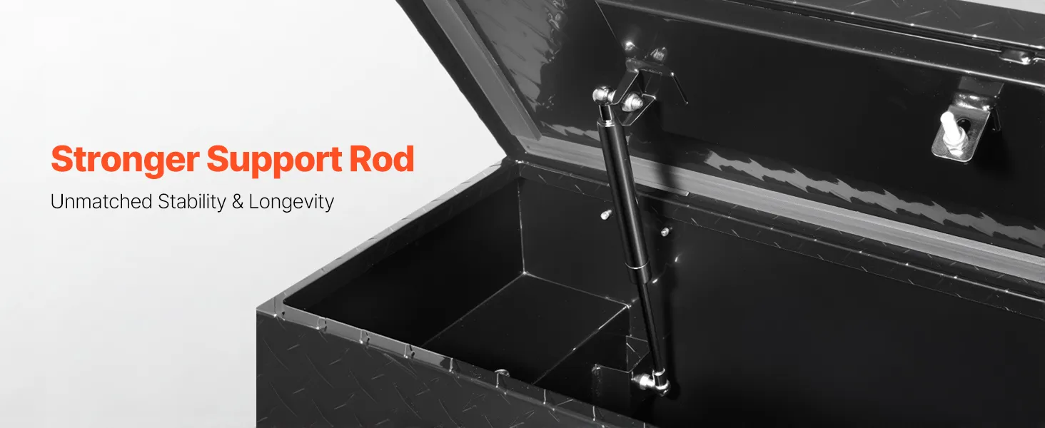 Náš 69-palcový box na náradie pre veľké zaťaženie je vyrobený z hrubého hliníka, ktorý unesie 110 kg. Jeho diamantový povrch zvyšuje odolnosť, zatiaľ čo konštrukcia odolná voči poveternostným vplyvom odoláva slnku, dažďu, prachu a mrazu. Zámok z nehrdzavejúcej ocele a 100N hydraulické vzpery zabezpečujú bezpečné uloženie a plynulé otváranie veka v uhle 70-90°.