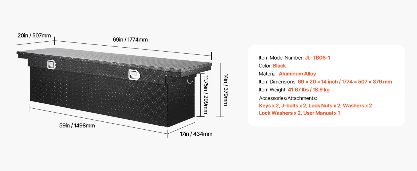 Tento box na náradie pre nákladné vozidlá je vyrobený z vysokokvalitného hliníka s hrúbkou 1,5 mm (0,058 palca), je pevný a odolný a unesie až 110 libier (50 kg). Je navrhnutý tak, aby odolal nerovnostiam na cestách, a zaručuje dlhodobú stabilitu a spoľahlivý výkon.