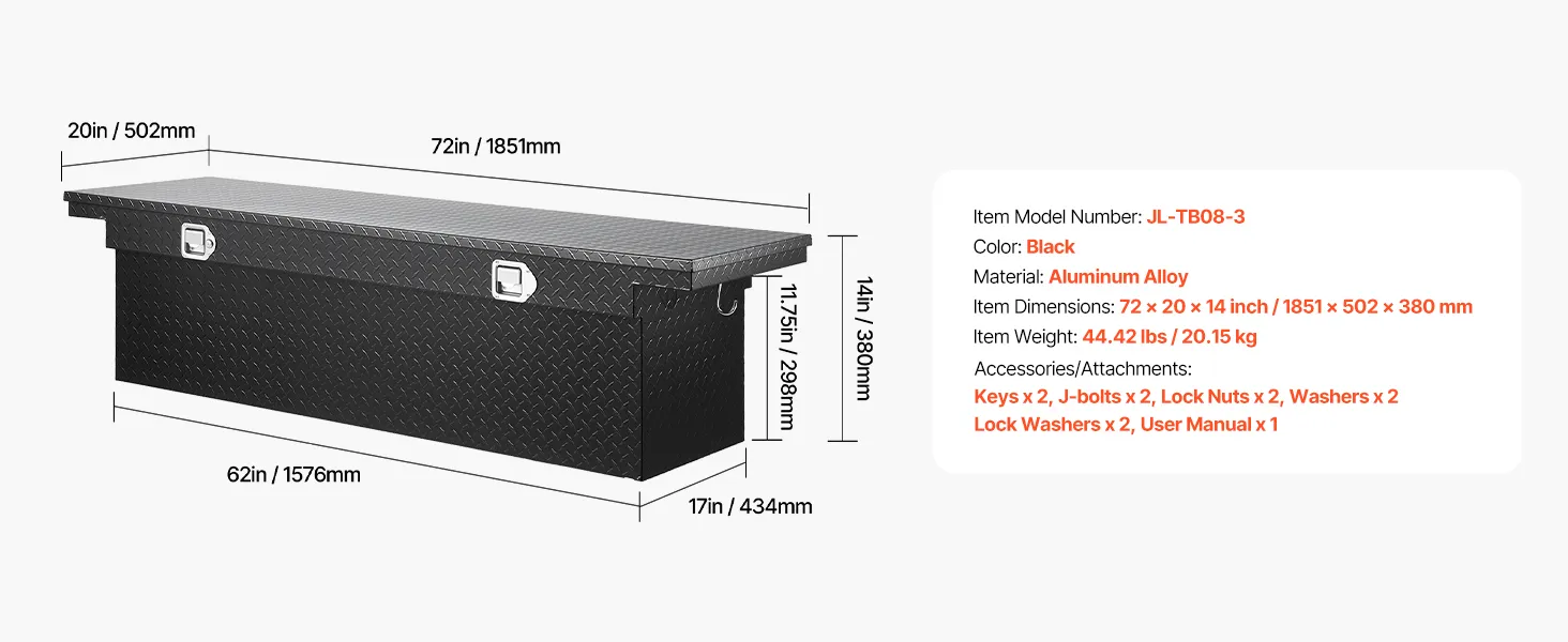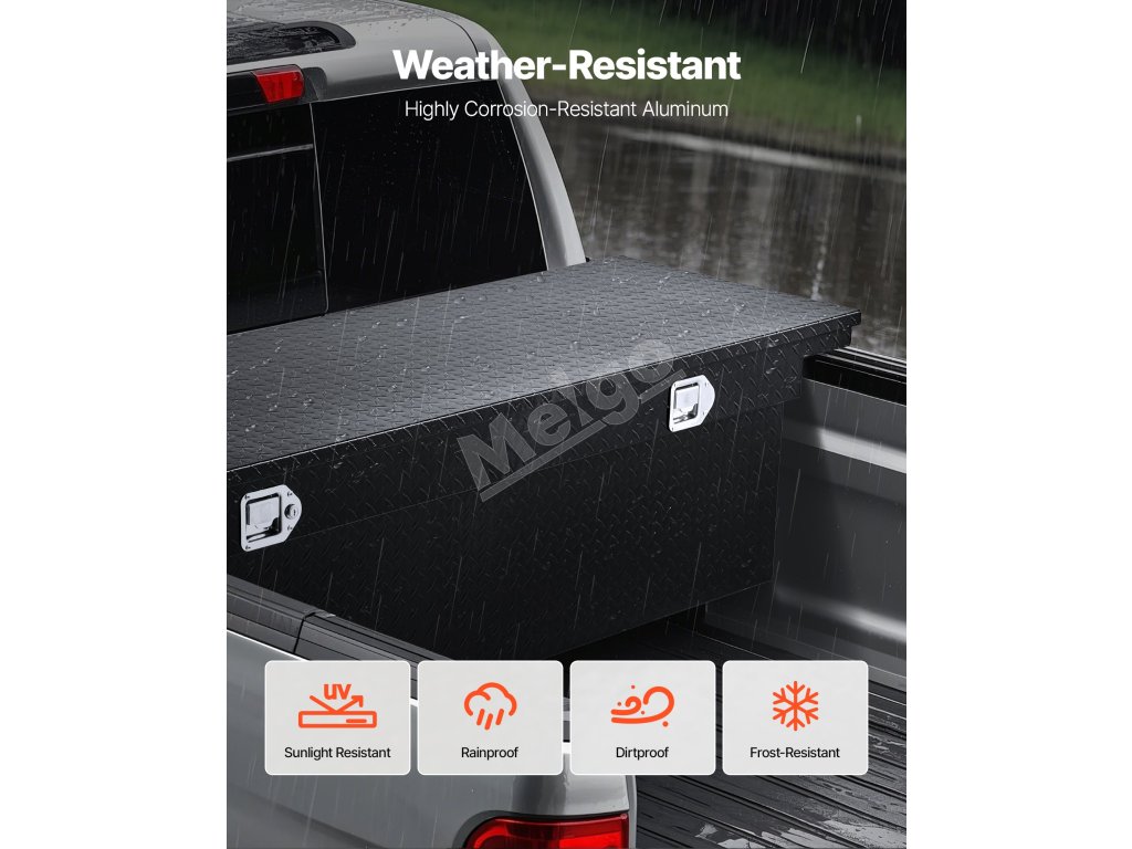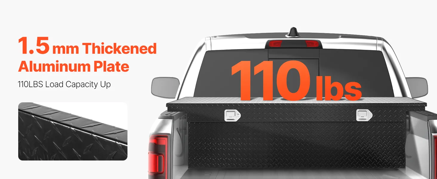 Tento box na náradie pre nákladné vozidlá je vyrobený z vysokokvalitného hliníka s hrúbkou 1,5 mm (0,058 palca), je pevný a odolný a unesie až 110 libier (50 kg). Je navrhnutý tak, aby odolal nerovnostiam na cestách, a zaručuje dlhodobú stabilitu a spoľahlivý výkon.
