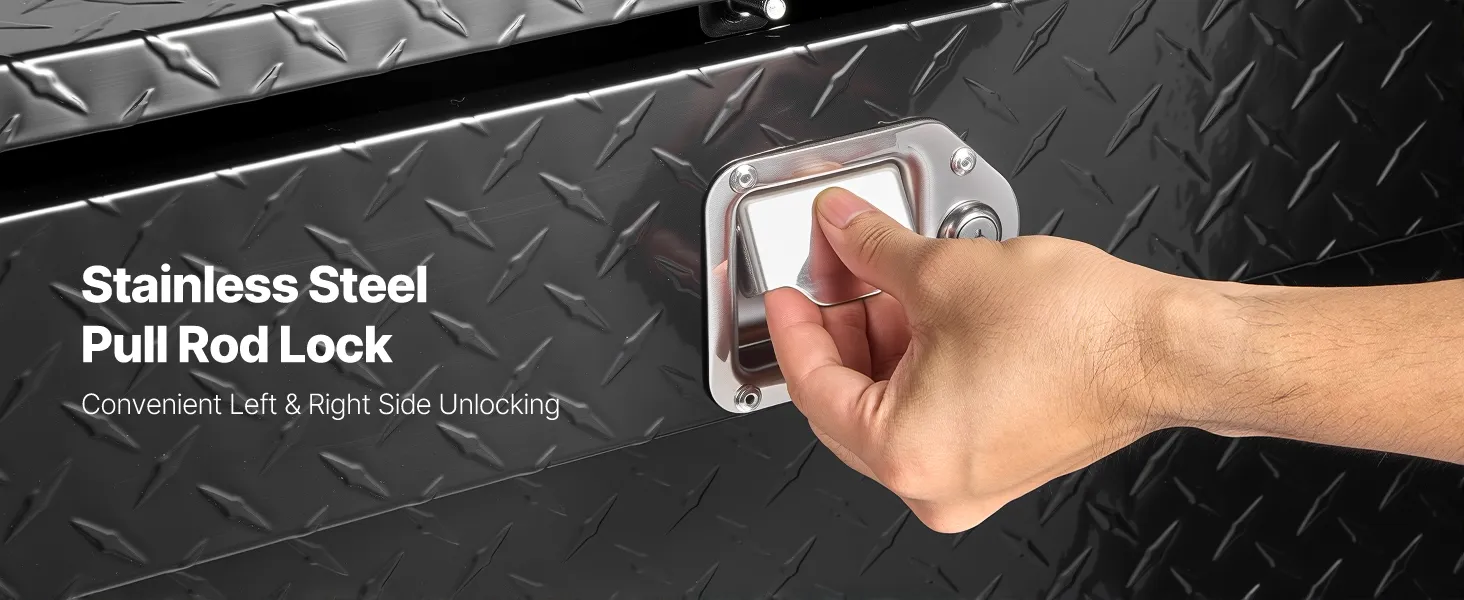 Tento podvozkový box na náradie, vybavený zámkom z nehrdzavejúcej ocele s ťahadlom a prepojeným mechanizmom, umožňuje jednostranné odomykanie, vďaka čomu je každodenný prístup pohodlnejší a efektívnejší.
