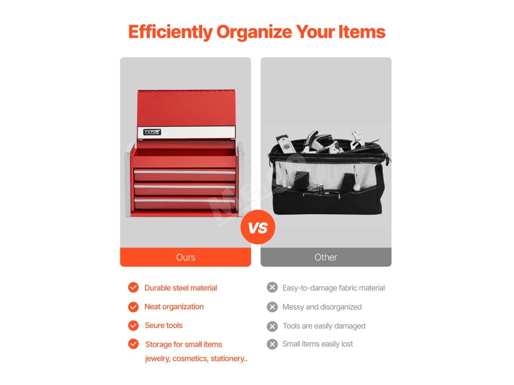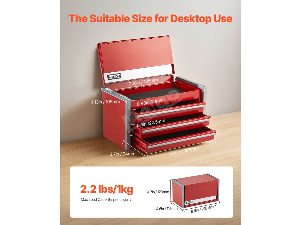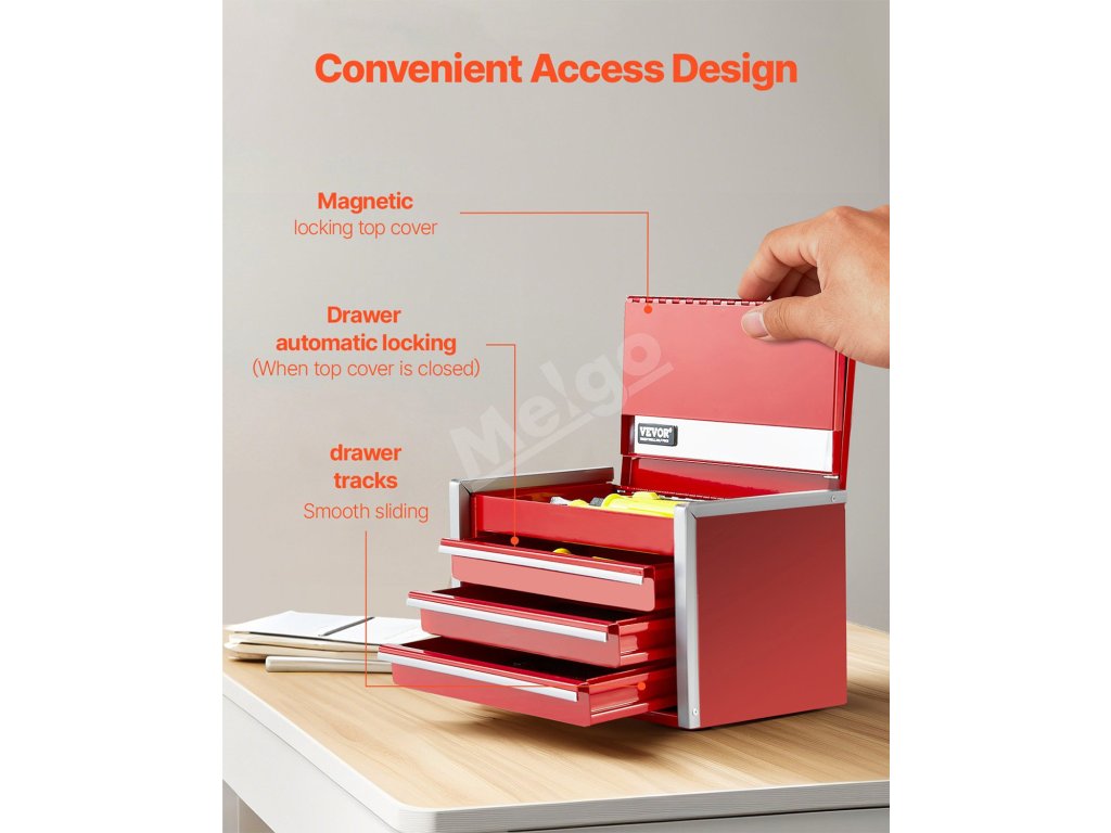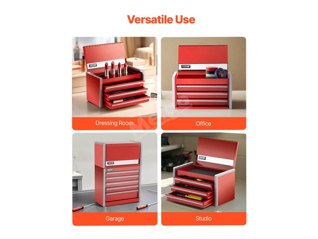 Mini kovový box na náradie obsahuje 1 hornú priehradku a 3 zásuvky, ktoré vám umožnia prehľadne kategorizovať predmety a udržiavať váš stôl uprataný a bez neporiadku.