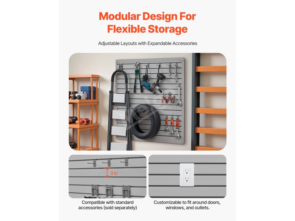 Konštrukcia s 3-palcovou šírkou štrbiny v lamelovom nástennom paneli je kompatibilná s univerzálnymi hákmi, konzolami, policami a iným úložným príslušenstvom, čo uľahčuje pridávanie alebo odoberanie veľkého náradia aj malých dielov.