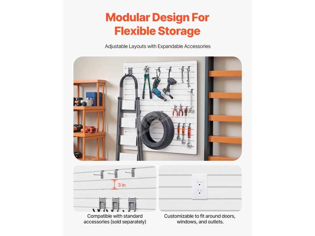 Konštrukcia s 3-palcovou šírkou štrbiny v lamelovom nástennom paneli je kompatibilná s univerzálnymi hákmi, konzolami, policami a iným úložným príslušenstvom, čo uľahčuje pridávanie alebo odoberanie veľkého náradia aj malých dielov.