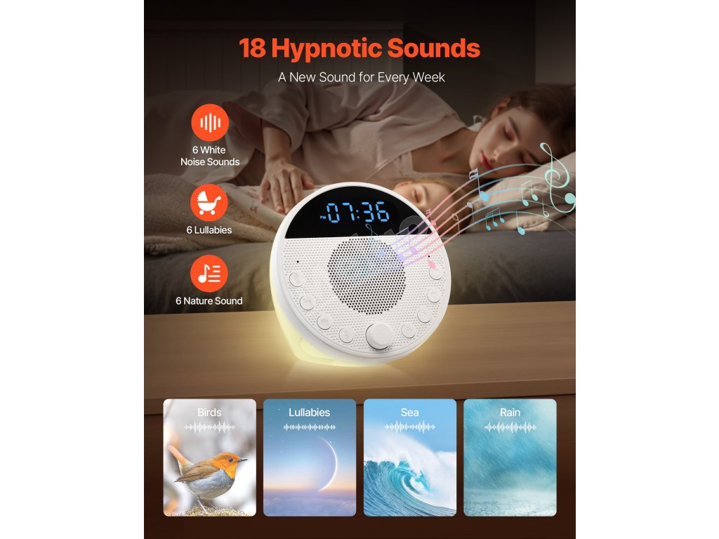 Stroj na biely šum, 18 zvukov, nočné svetlo 7 farieb, 2 budíky, app