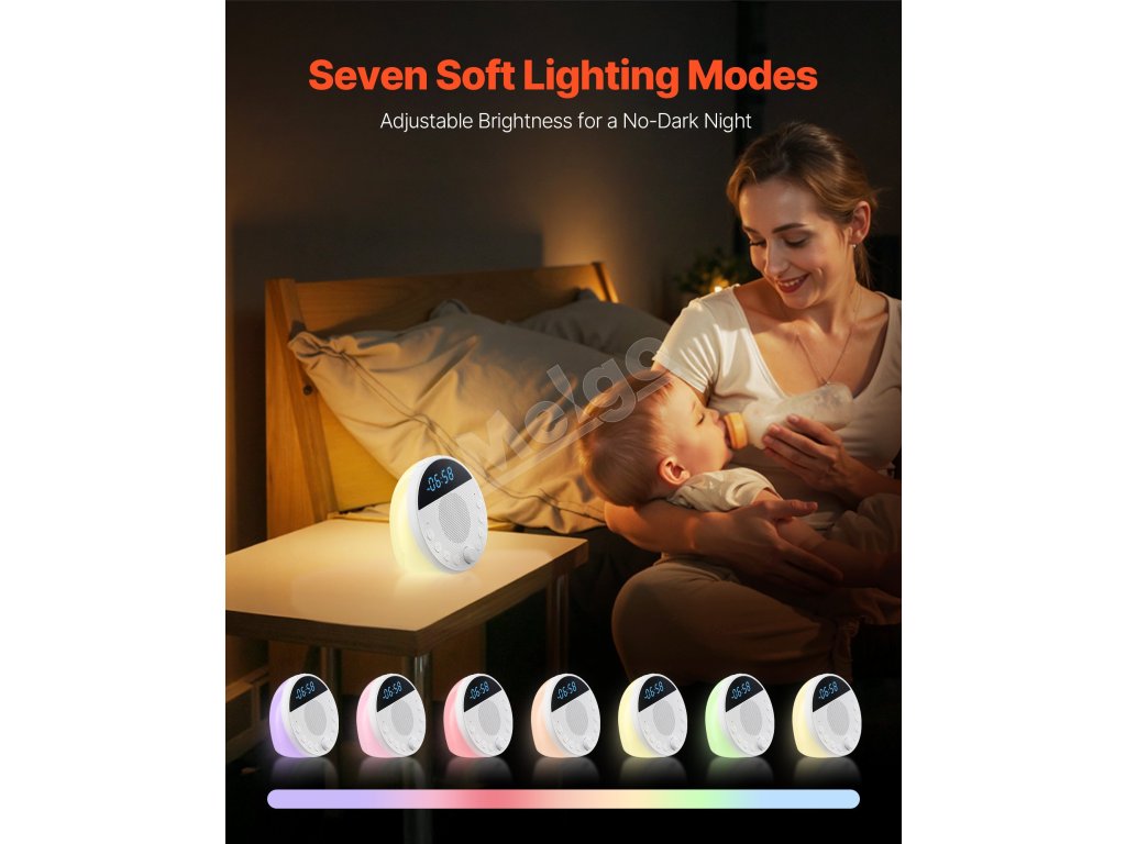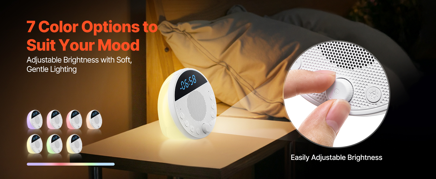 Prenosný strojček na biely šum je vybavený nastaviteľným viacfarebným nočným osvetlením so 7 farbami a nastaveniami jasu, čím vytvára upokojujúce prostredie na spánok. Jemné svetlo je šetrné k očiam a jednoduché ovládanie pomocou tlačidiel zabezpečuje bezproblémové nastavenie pre pokojný spánok.