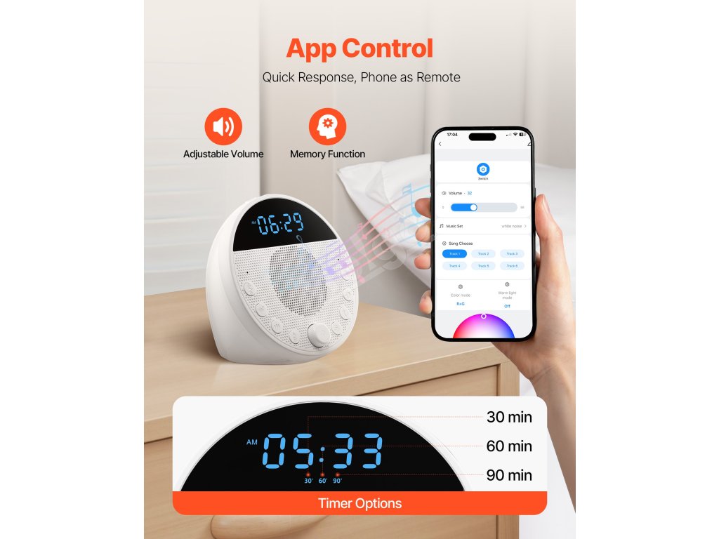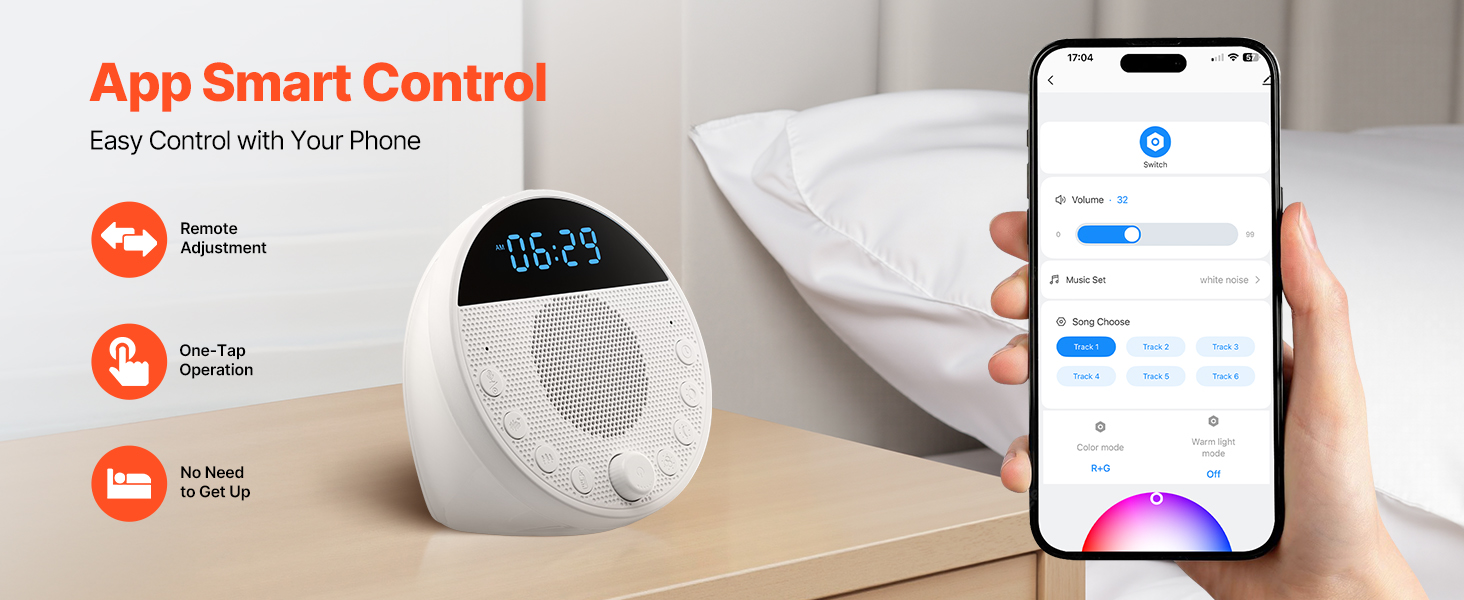 Toto zariadenie na podporu spánku možno ovládať prostredníctvom aplikácie, ktorá umožňuje diaľkovo nastaviť zvukové efekty, hlasitosť, nočné osvetlenie a funkcie časovača z telefónu, takže nemusíte vstávať za tmy a užívať si maximálne pohodlie technológií