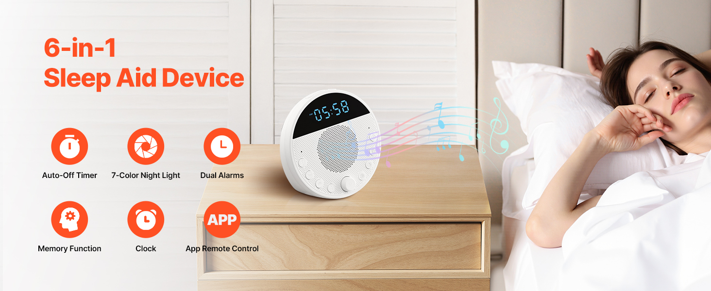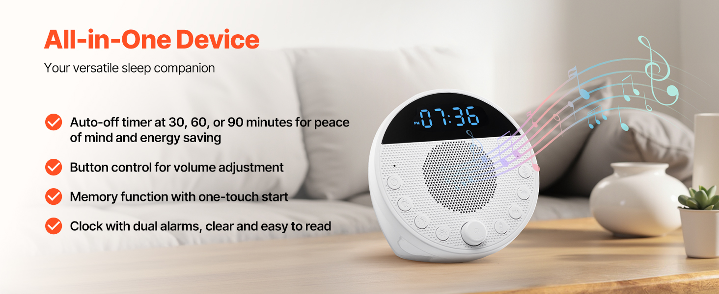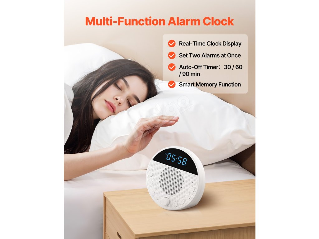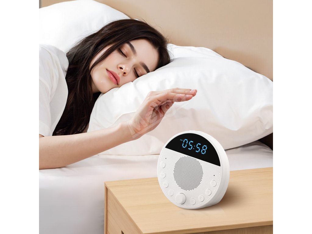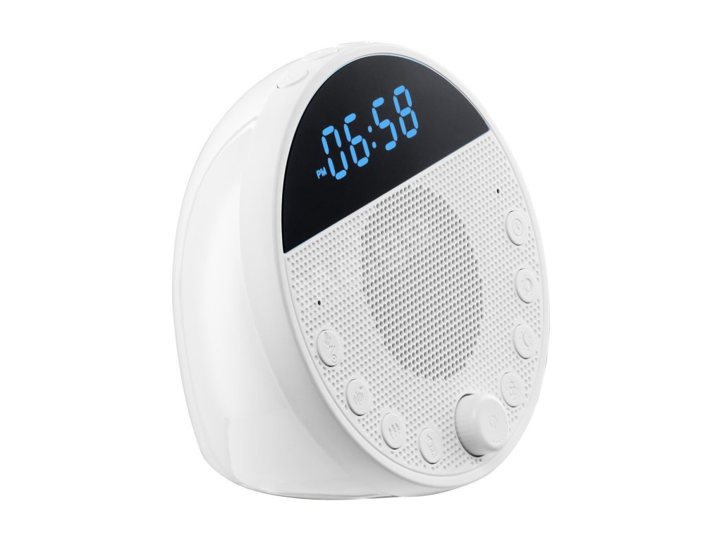 Tento prístroj s bielym šumom obsahuje časovač, ovládanie hlasitosti a pamäťovú funkciu na jednoduché nastavenie. Hodiny a dvojitý budík zabezpečia, že sa zobudíte včas, zatiaľ čo časovač vám umožní zaspať bez obáv z vybitia batérie.
