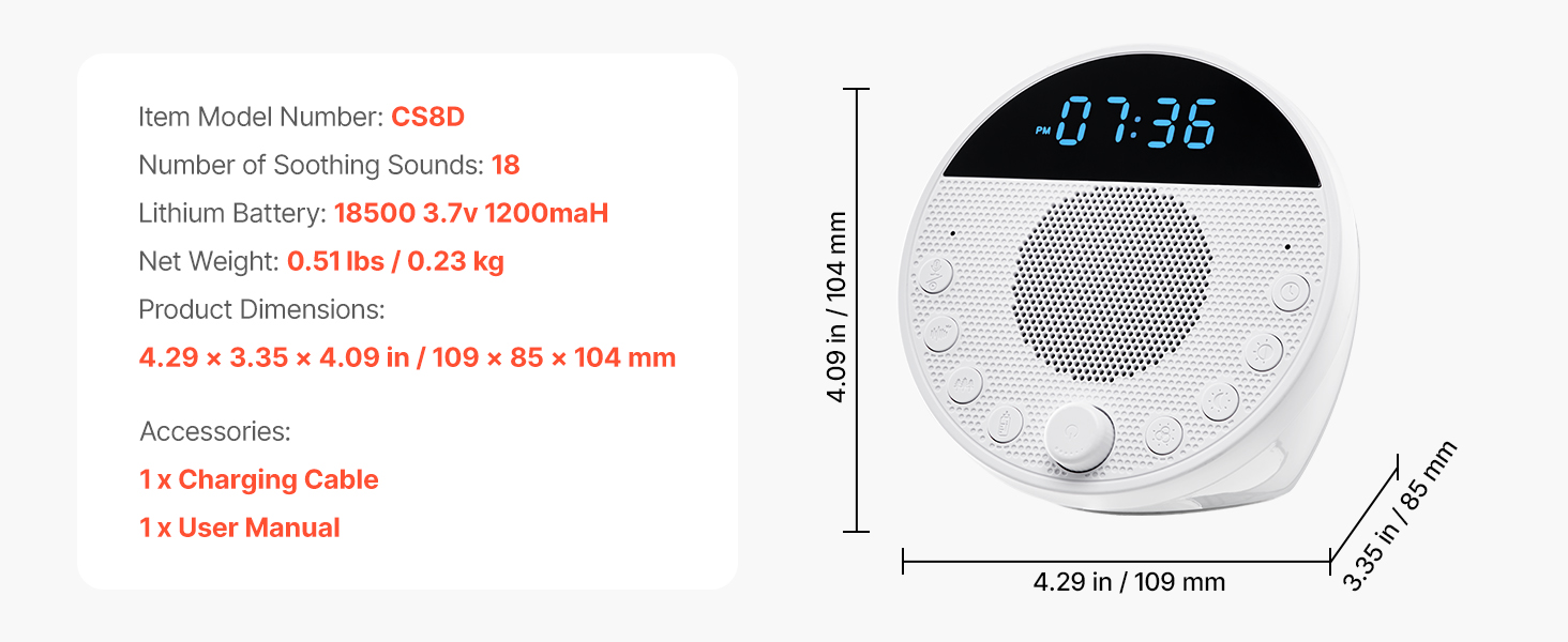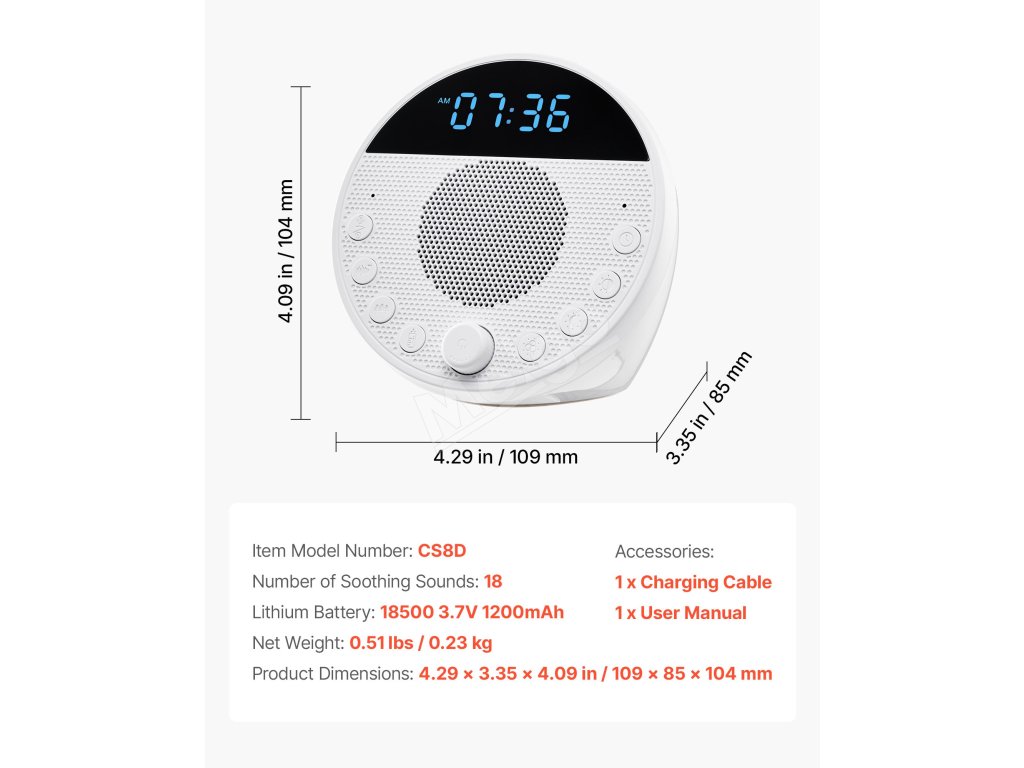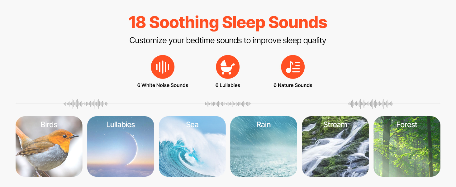 Tento prístroj s bielym šumom obsahuje 18 vysoko verných zvukových efektov vrátane rôznych bielych zvukov, uspávaniek a zvukov prírody, ktoré vytvárajú bohaté zvukové prostredie, ktoré vám pomôže ľahko sa ponoriť do spánku a ponoriť sa do upokojujúcich zvukov.