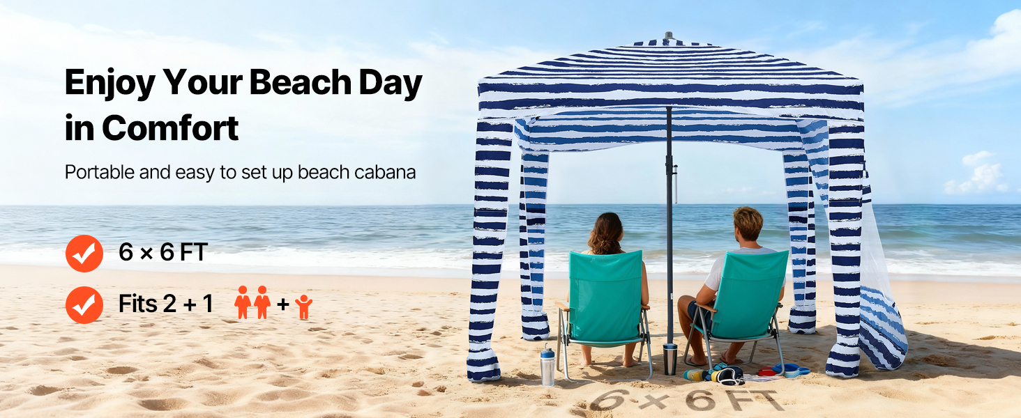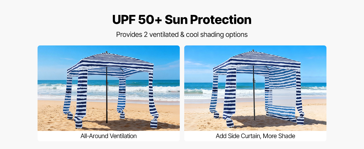 Tento plážový stan Cabana poskytuje ochranu pred slnkom až UPF 50+ a je vybavený odnímateľnou bočnou zástenou. Pripevnite ju pre maximálny tieň alebo ju odpojte a užite si otvorený, dobre vetraný priestor.