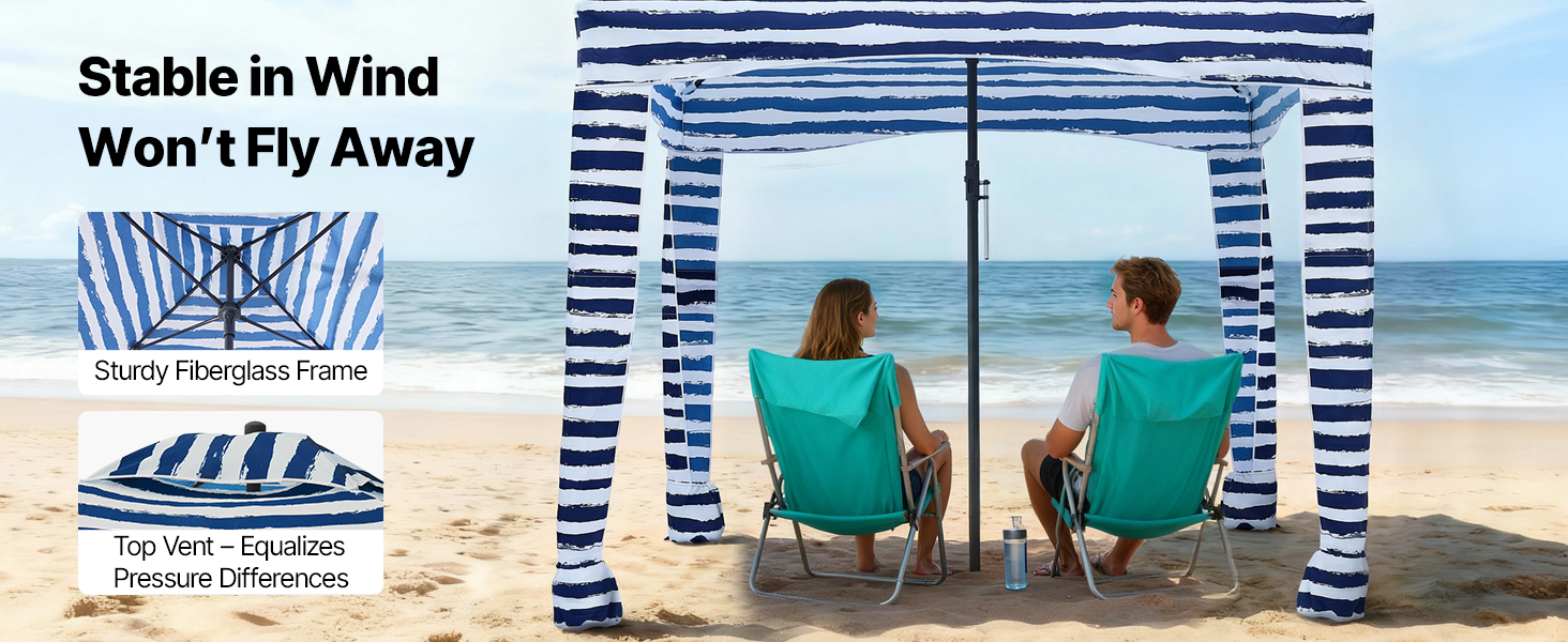 Pevný rám zabraňuje ohýbaniu alebo deformácii vo veternom počasí. Vrchný ventilačný systém vyrovnáva vnútorný a vonkajší tlak vzduchu, čím udržiava veľkú plážovú kabínu stabilnú a zároveň podporuje prúdenie vzduchu.
