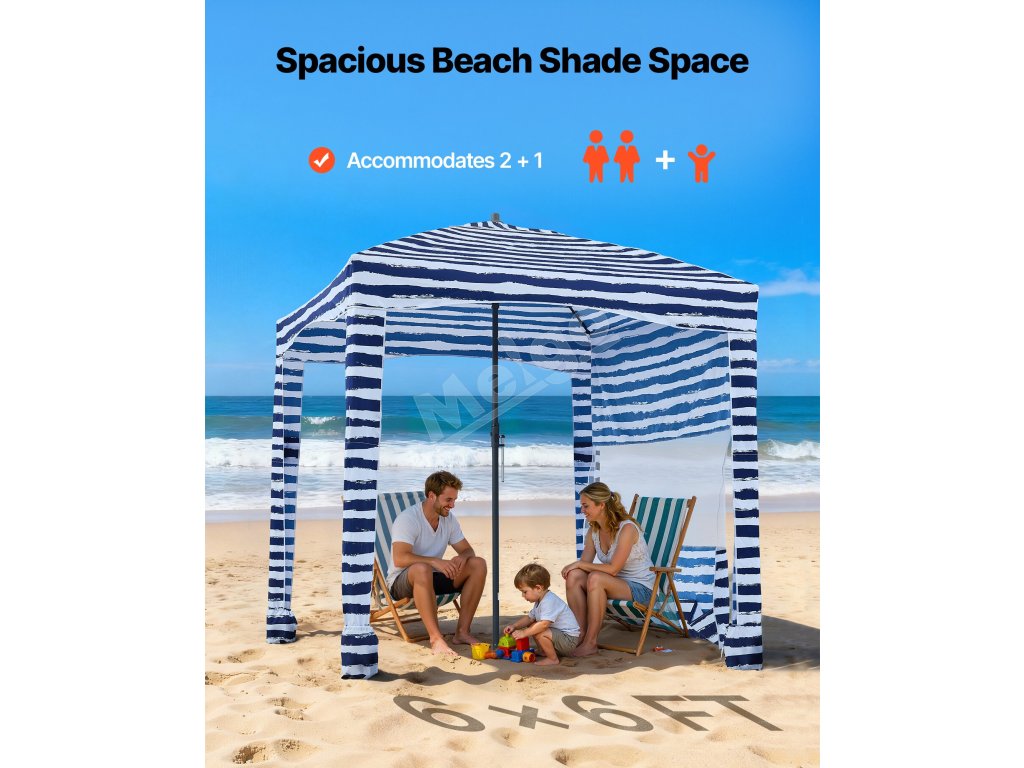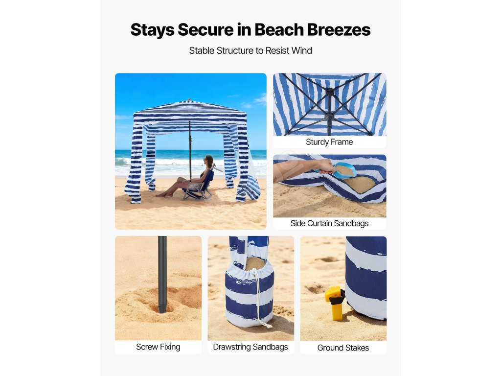 Pevný rám zabraňuje ohýbaniu alebo deformácii vo veternom počasí. Vrchný ventilačný systém vyrovnáva vnútorný a vonkajší tlak vzduchu, čím udržiava veľkú plážovú kabínu stabilnú a zároveň podporuje prúdenie vzduchu.